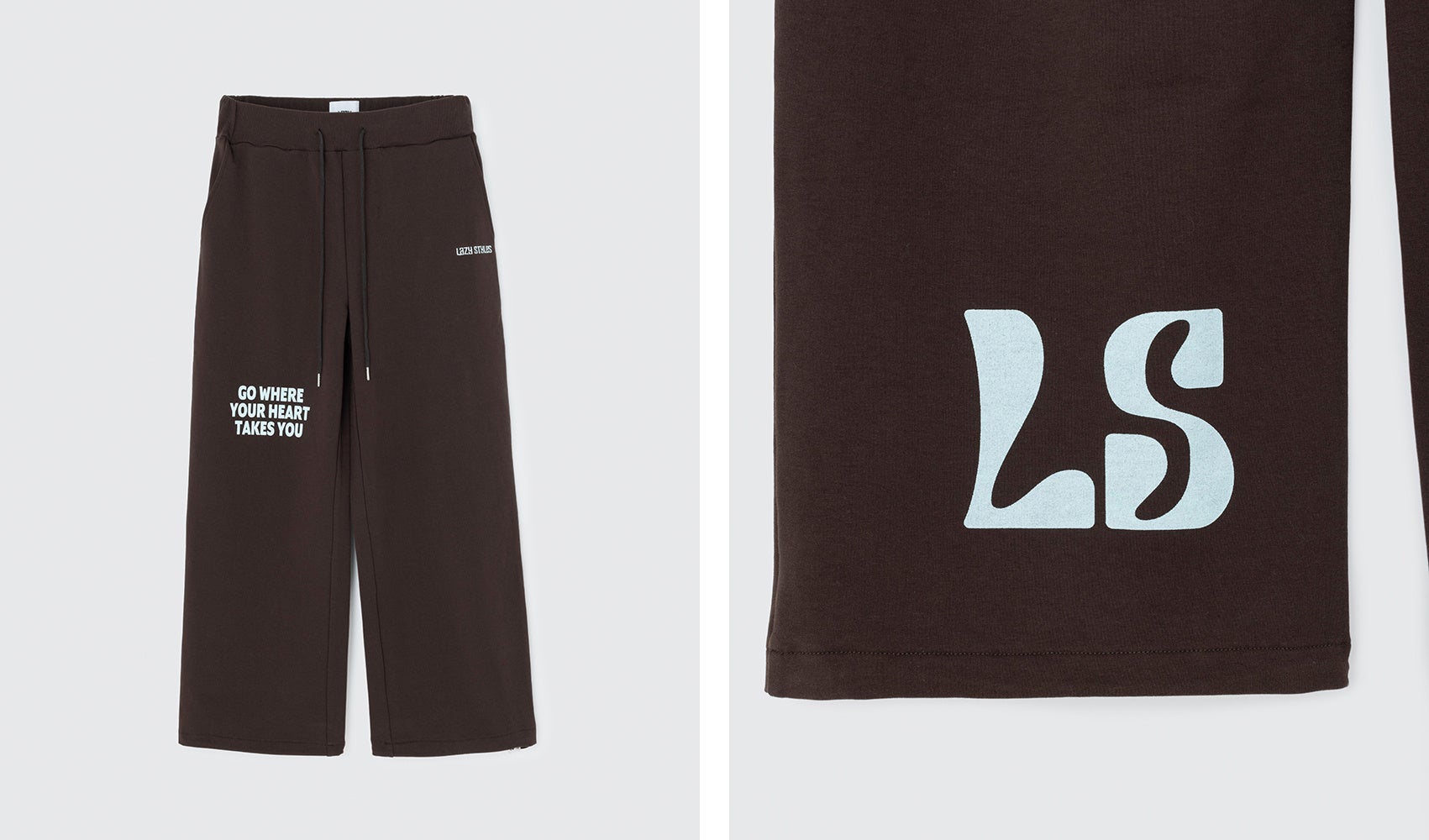 「GO WHERE YOUR HEART TAKES YOU」のメッセージが主役のスウェットパンツ。左ポケットの下にブランドロゴの刺繍、バックの足元には「LS」ロゴを大きくプリント。裾はドローコードで調節ができ、ゆったりとしたワイドシルエットから足首を絞ったバルーンシルエットまで気分に合わせて楽しめます。両サイドにベルトループがついているので、キーホルダーやベルトチェーンなどでカスタムするのもおすすめです。