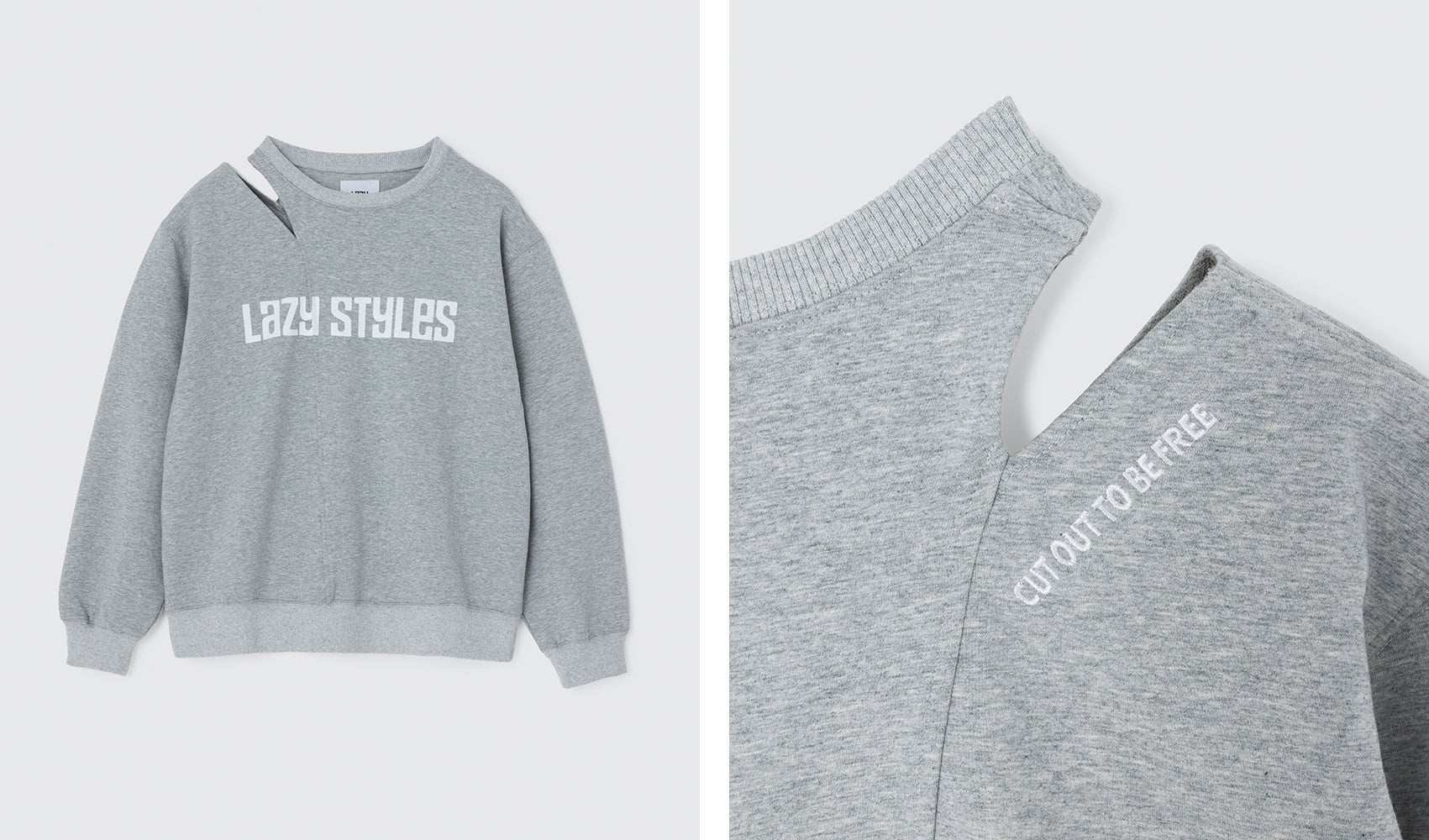 ブランドロゴがフロントに入ったスウェットは、ショルダーのカッティングがポイント。カットラインに沿って入れられた「CUT OUT TO BE FREE」というメッセージに、大胆なデザインから新たな自分の可能性に出会ってほしいという想いを込めています。