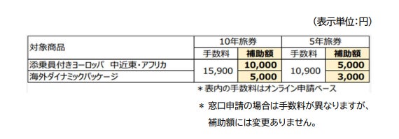 キャンペーン期間中に新たに申請するパスポートの種類、申し込む対象商品によって補助額が異なります。