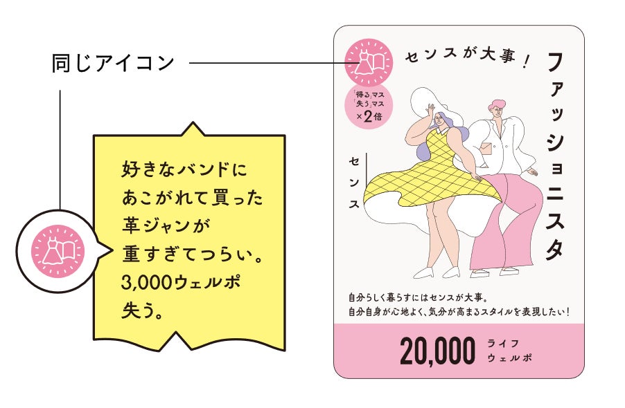 たとえば、下図のケースではアイコンが一致しているので、カードの記載「失うマス×2倍」に従い、「3,000ウェルポ失う×2」で6,000ウェルポ失います。