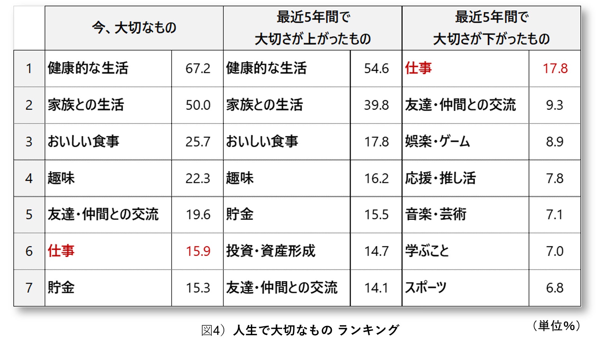まず、「あなたの人生において、今、大切なものは何ですか」と聞いたところ「健康的な生活」(67.2%)が抜きんでて高く、「仕事」(15.9%)は6番目となりました。また、「最近5年間で大切さが下がったもの」では、「仕事」(17.8%)が1番目。価値観が変化する中で、仕事の重視度が低下傾向にあることがわかりました。