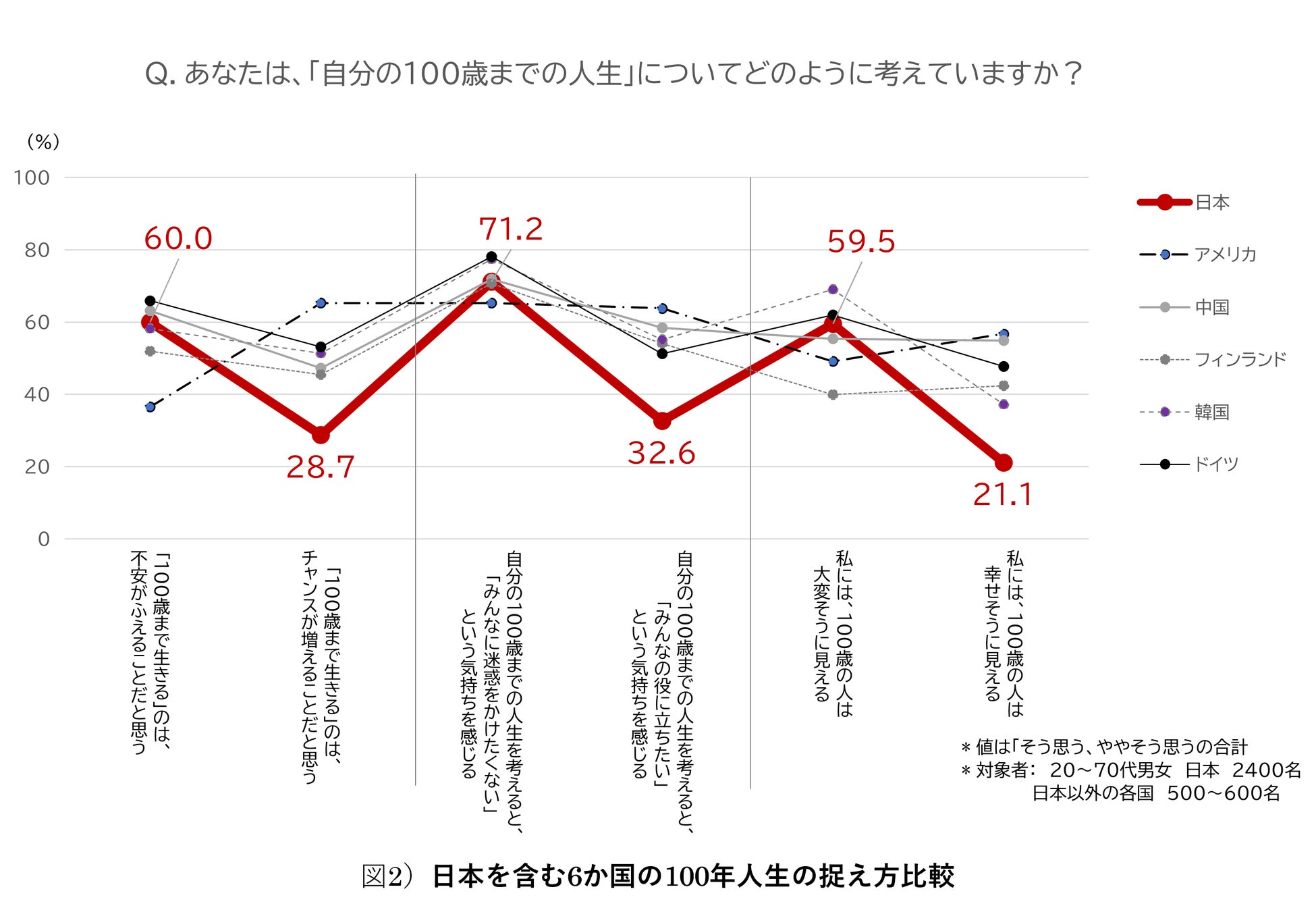 また、今年3月に6か国(日本・アメリカ・中国・フィンランド・韓国・ドイツ)で実施した調査では、日本のみ「生きたい年齢=希望寿命」が81.1歳と平均寿命より短い結果でした。(図1)その一つの要因として日本人は長寿のネガティブな面だけを見て、ポジティブな面を見る人が少ないことがわかりました。