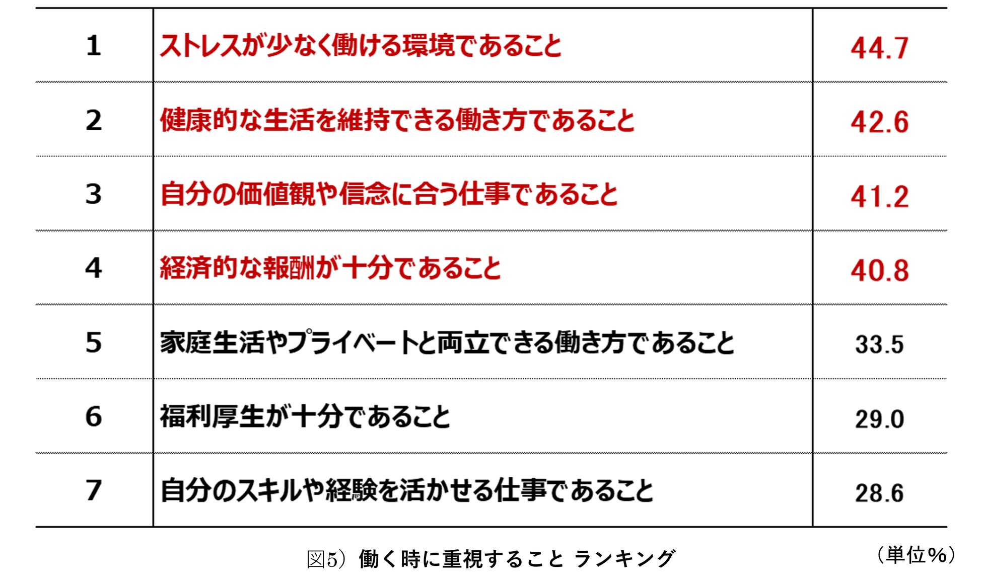 次に「働く時に重視すること」について聞きました。その結果、「ストレスが少なく働ける環境」(44.7%)「健康的な生活を維持できる」(42.6%)「自分の価値観や信念に合う仕事」がトップ3で、「十分な報酬」よりも高い結果となりました。