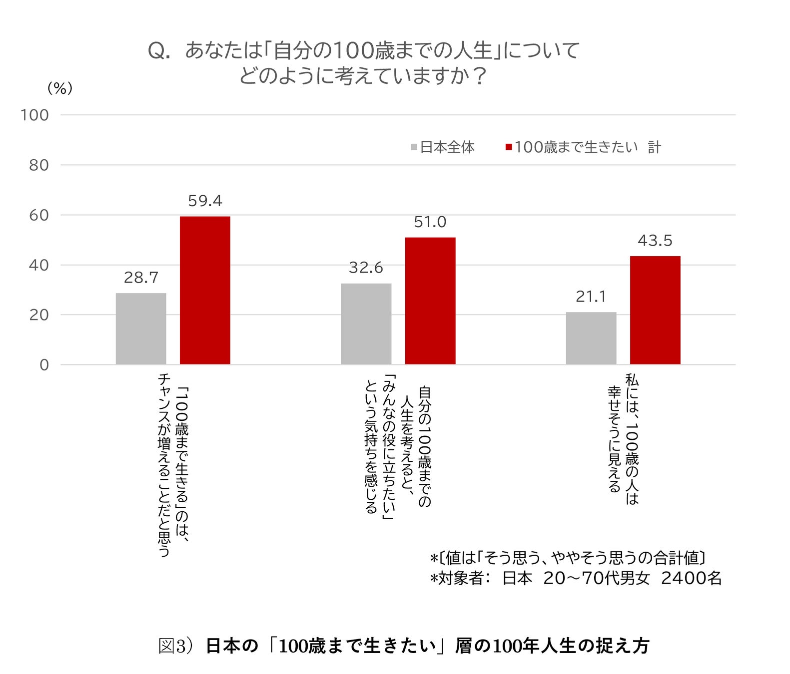 但し、日本でも「100歳まで生きたい」と考える人に限っては、「チャンスが増える」(59.4%)、「幸せそうに見える」(43.5%)など、日本全体では低かった、長生きに関するポジティブな項目が高い傾向にありました。
