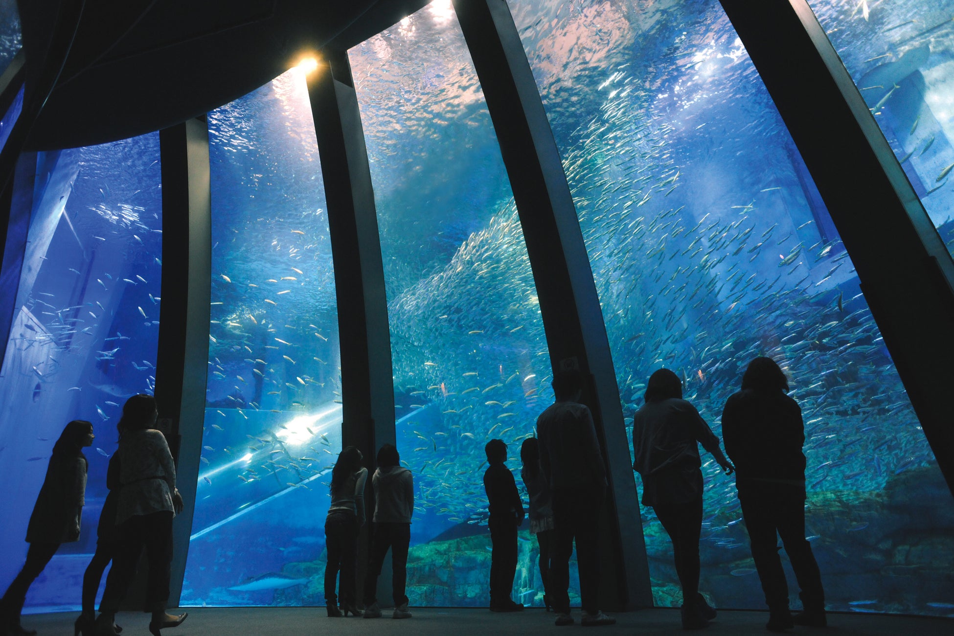 水族館「アクアミュージアム」にある高さ8m、水量1,500トンの大水槽「大海原に生きる群れと輝きの魚たち」では、国内最多飼育数5万尾のイワシが音楽や照明に合わせ乱舞する幻想的なパフォーマンス「スーパーイワシイリュージョン」を毎日開催しております。
