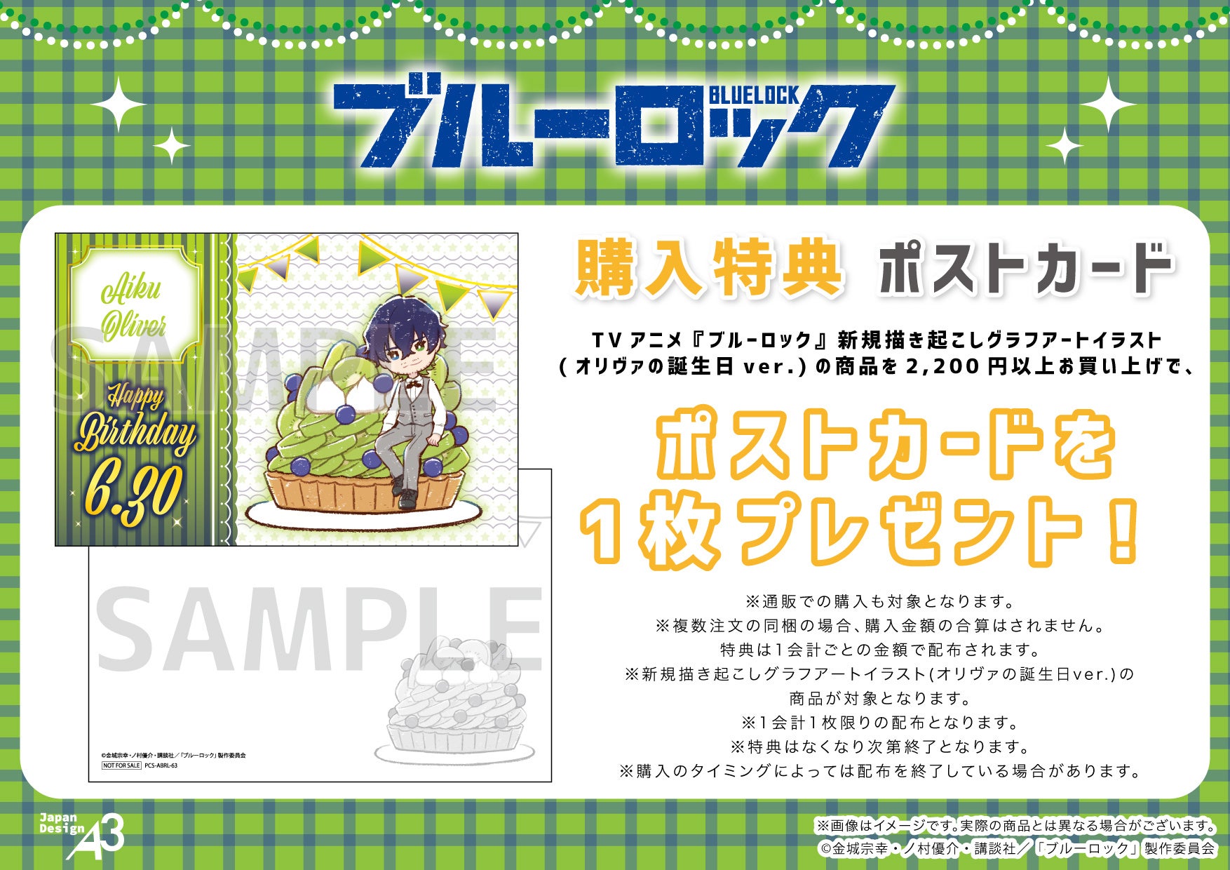 TVアニメ『ブルーロック』の新規描き起こしグラフアートイラスト(オリヴァの誕生日ver.)の商品を2,200円(税込)以上お買い上げで、ポストカード(全1種)をプレゼント!
