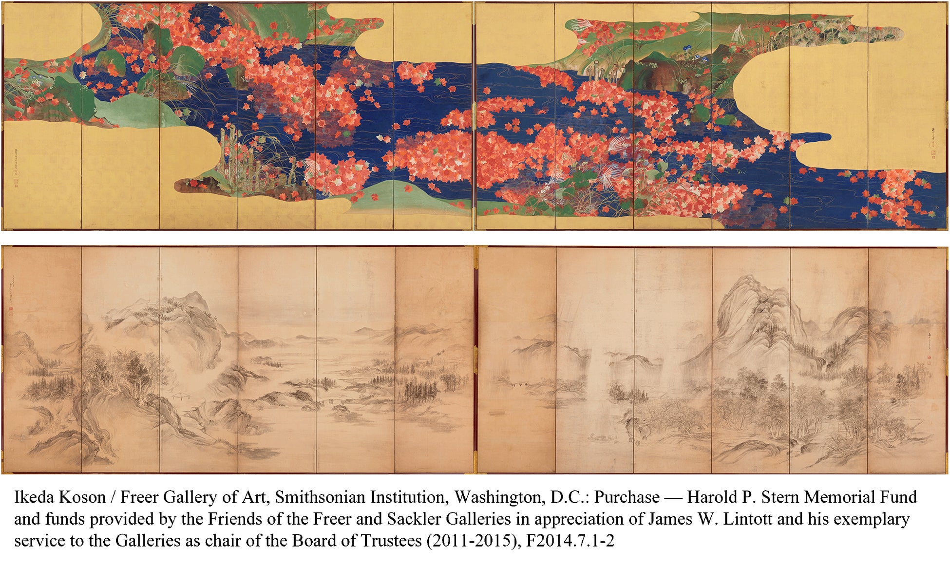 ①「紅葉に流水・山景図屏風」(池田孤邨 筆) *画像上段:屏風の表、下段:裏