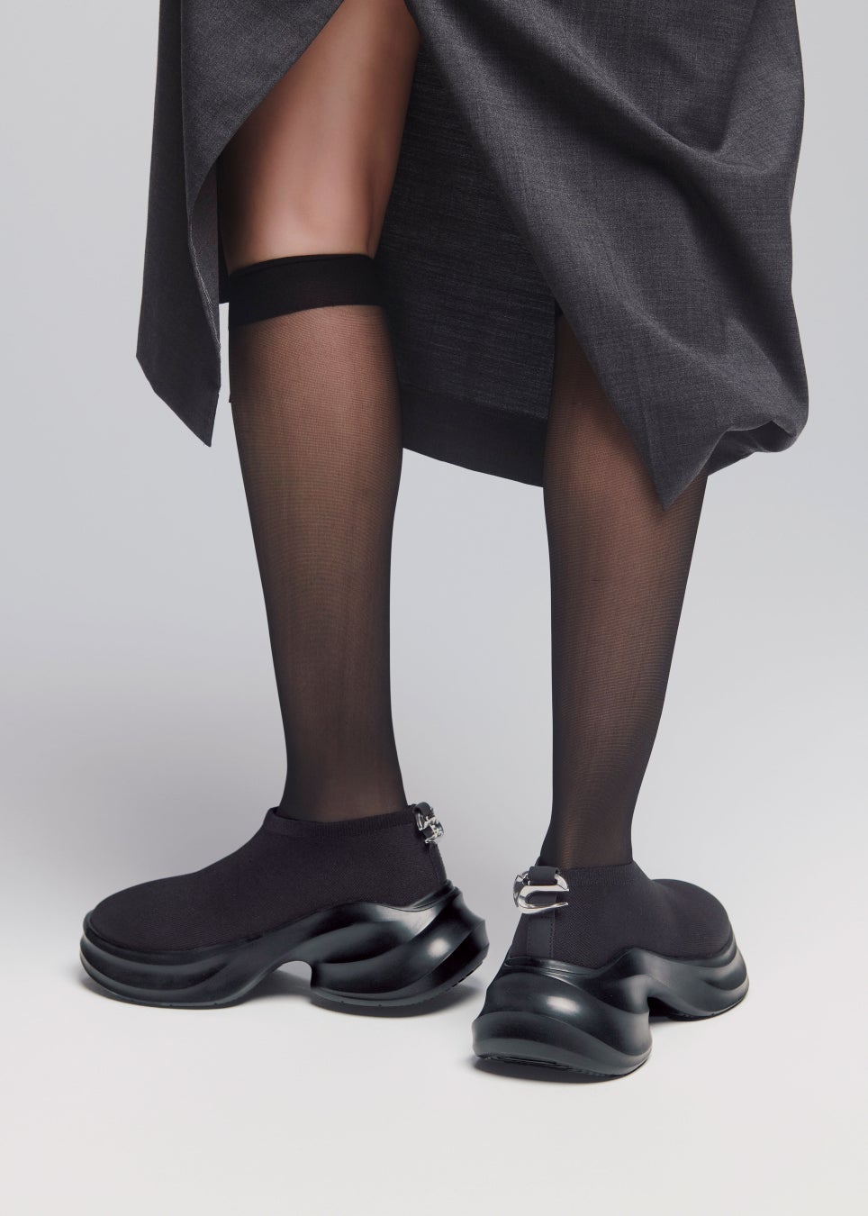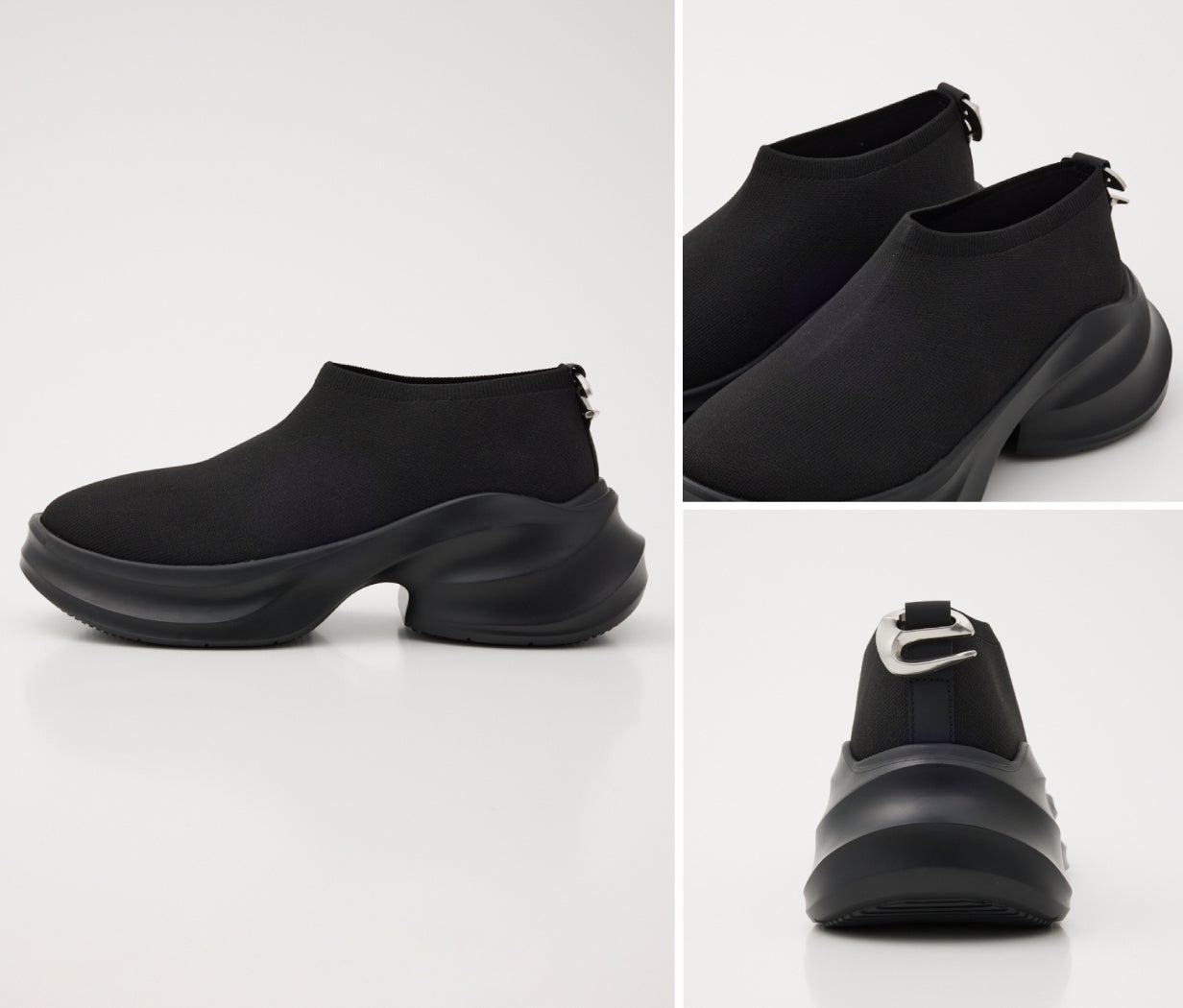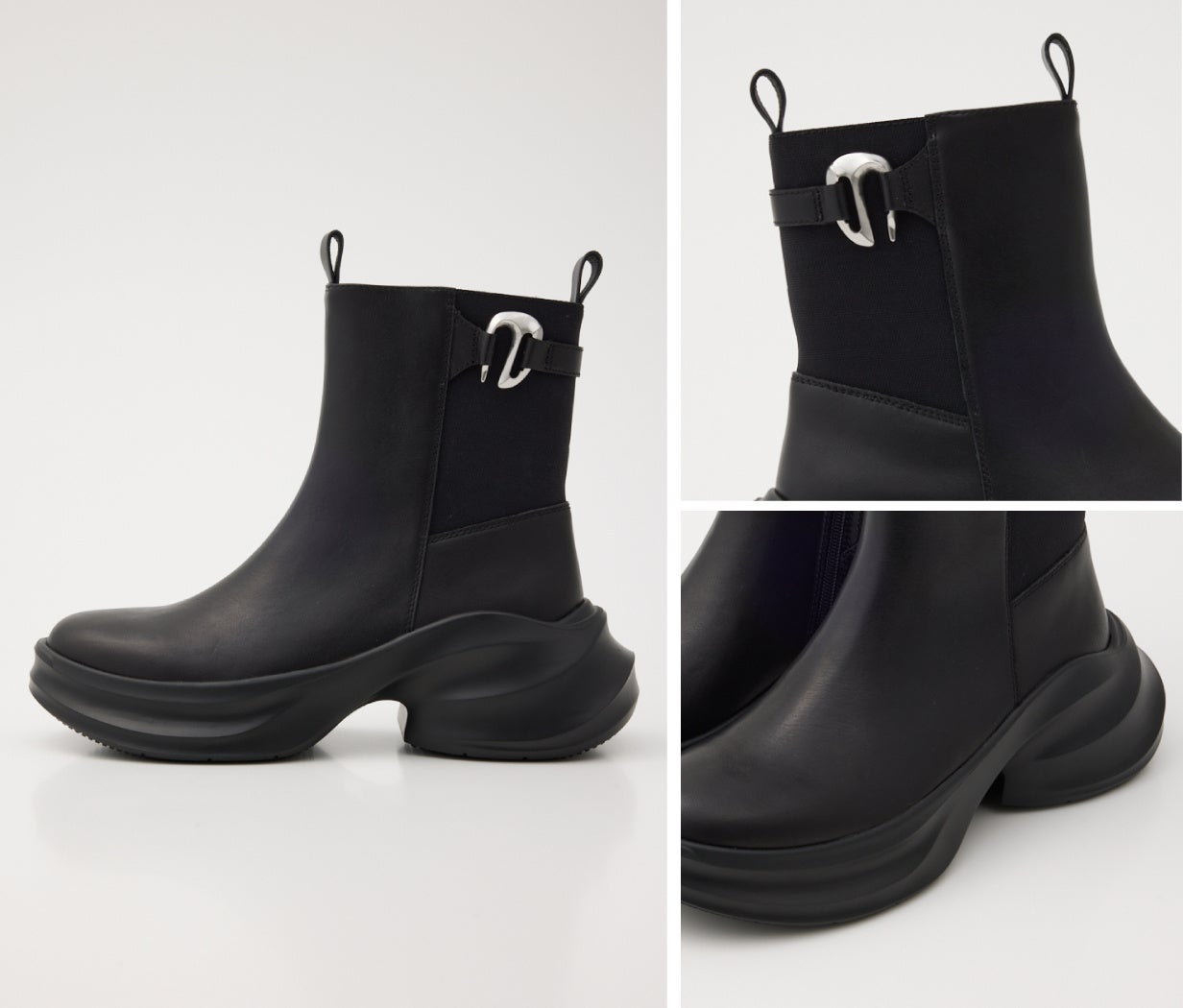ラインシルエットが美しい彫刻のようなソールに、E字型のオリジナルシルバーバックルが全アイテムに施され、未来的な流線感と独特の美的質感を表現しています。
