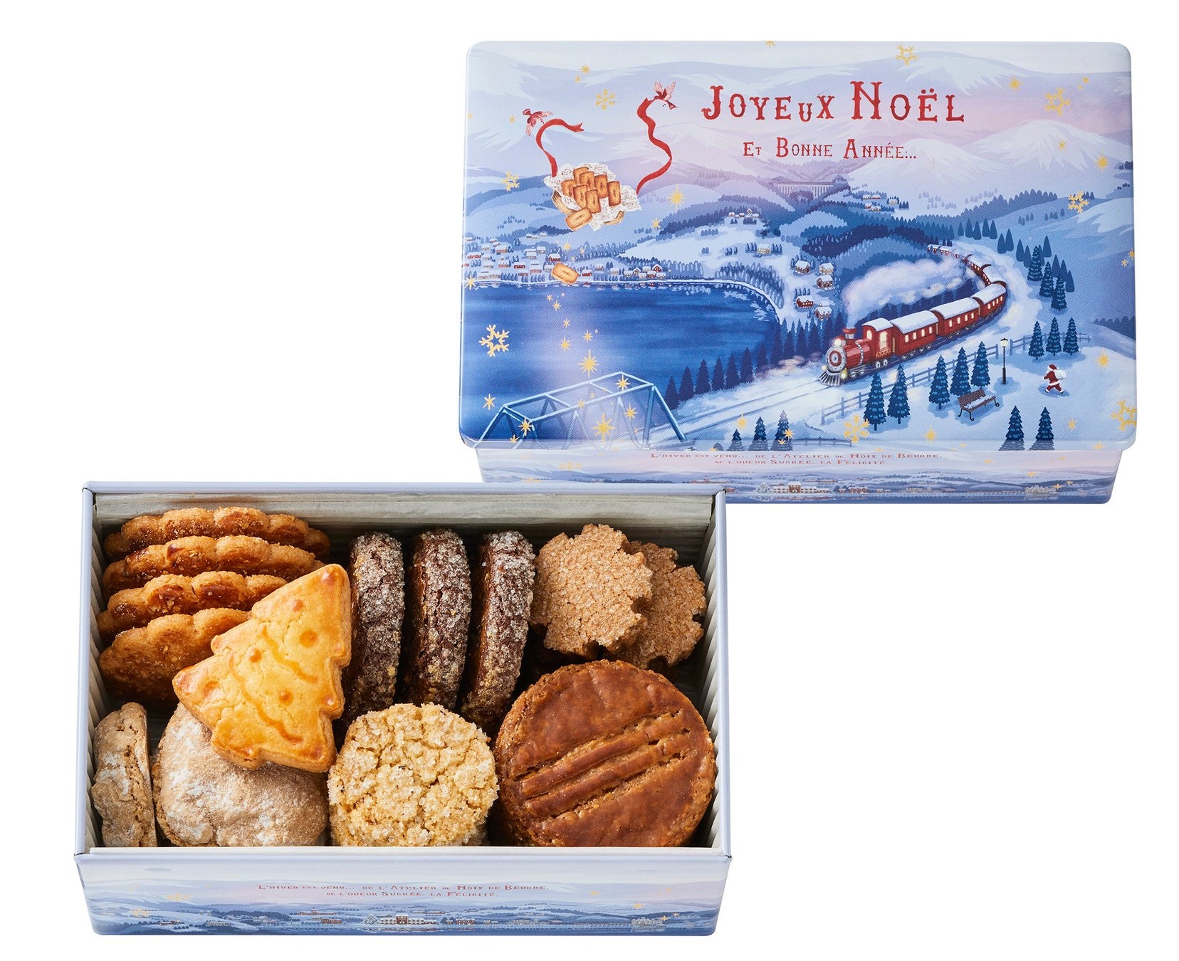 ノワ・ドゥ・ブールのクリスマスギフトは、パティシエのお家からフィナンシェを運ぶ小鳥たちが巡る風景を、ストーリー仕立てのイラストで表現しています。絵本のような可愛い缶の中には、雪の結晶型の「シナモンクッキー」の新作に加え、ツリー型の「バニラクッキー」、フランス産ミルク風味豊かな発酵バターを使用した「ガレット・ブルトンヌ」、カリカリッとした食感とナッツの風味豊かな「クロッカン」、ココナッツ味の「ココナッツ」、ほろりと崩れるココア味の「ディアマンショコラ」、香り高いヘーゼルナッツの味わいが楽しめる「ヘーゼルナッツサブレ」の7種類を詰め合わせています。