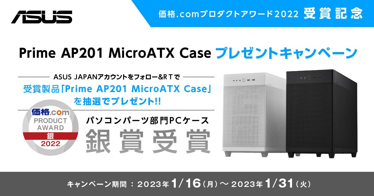 ASUS JAPAN株式会社は、価格.comプロダクトアワード2022にてパソコンパーツ部門PCケースで銀賞の受賞を記念して、Prime AP201 MicroATX Caseが抽選で計2名に当たるTwitterキャンペーンを開催中です。