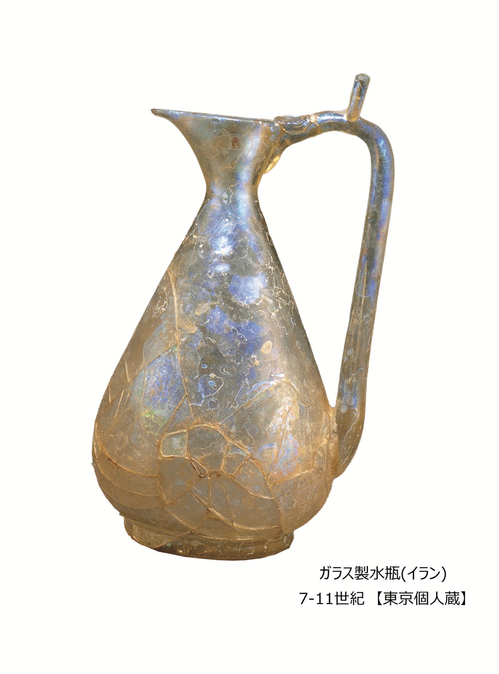 透明な輝きをみせるガラスは当初は王侯貴族(おうこうきぞく)のみが使う贅沢品でしたが、紀元前1世紀頃シリア・パレスチナで登場した吹きガラス技法が伝わってからは大量生産が可能となり、より広く普及します。展示では、1〜3世紀の小さなガラスの香油瓶に始まり、ガラス生産が盛んになったサーサーン朝ペルシア時代に作られた正倉院タイプのカットガラスや、初期イスラーム時代のガラス碗やガラス瓶のほか、装身具に用いられたガラス玉やガラス製腕輪などを展示します。