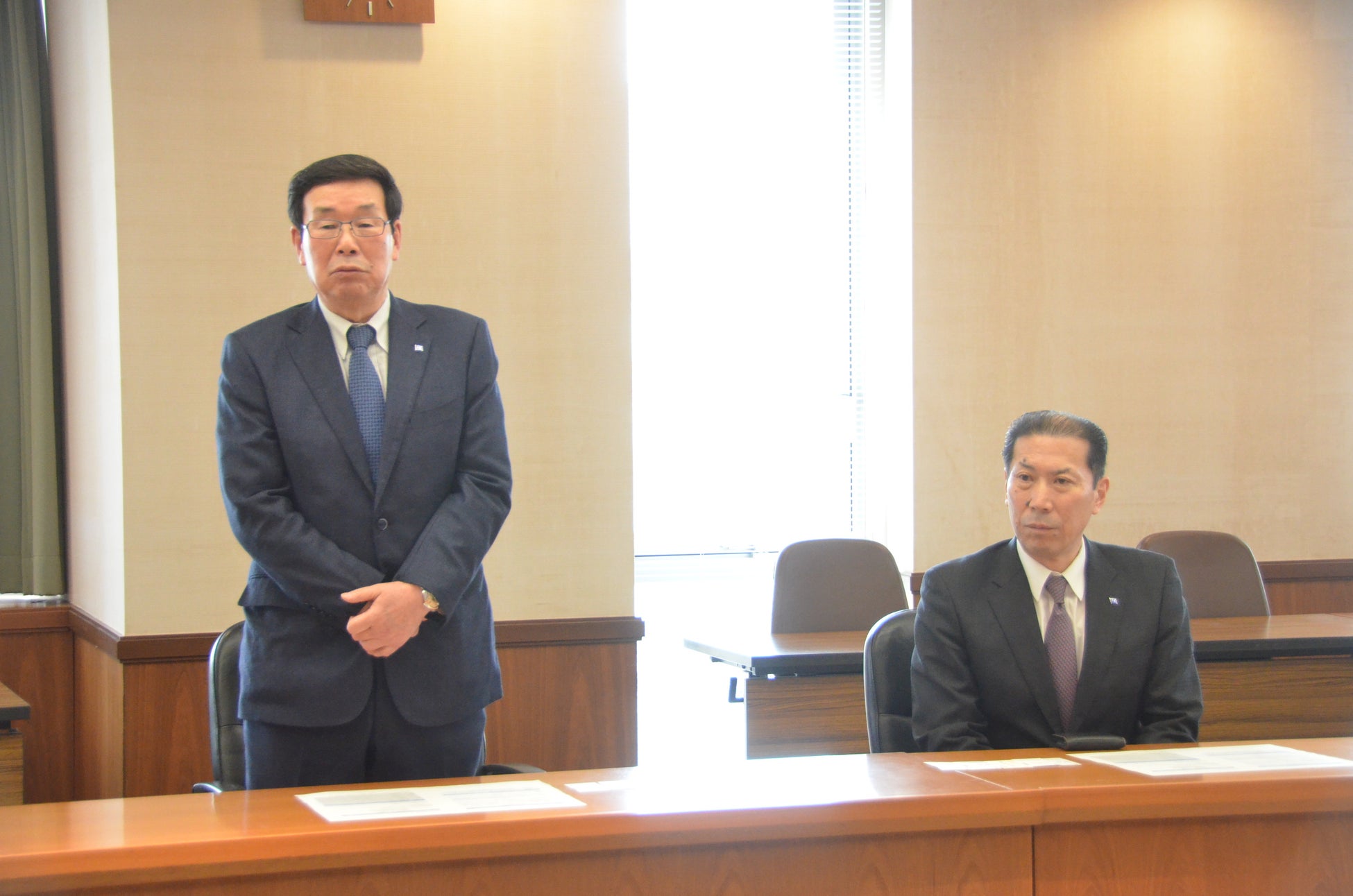 髙見社長らは、市役所の最上階で工事の様子を見られることを長坂市長から聞き、式後、13階に上がって現場の様子を眺めました。
