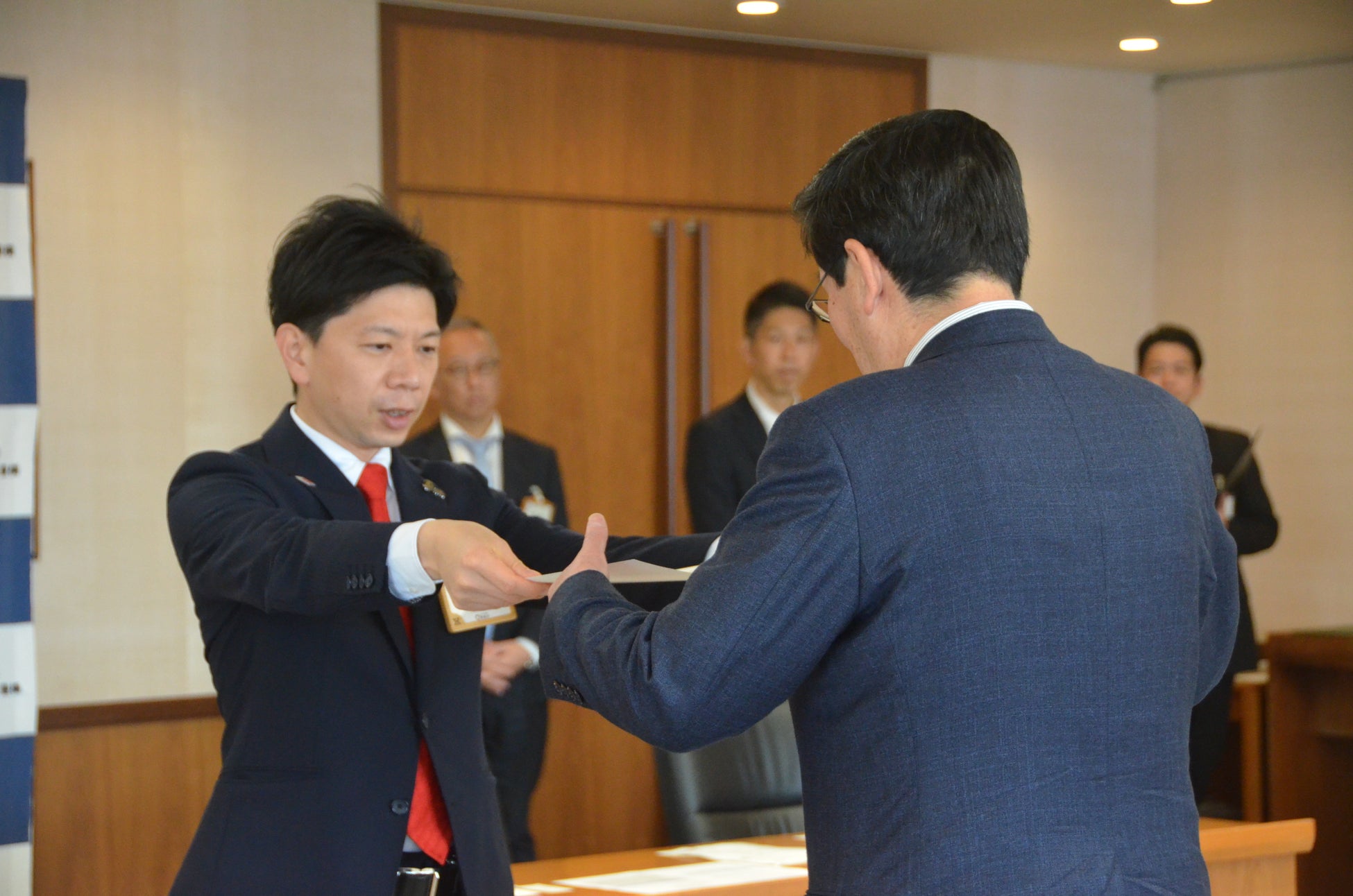 式では、長坂尚登市長から髙見昌伸代表取締役社長へ感謝状が贈られました。