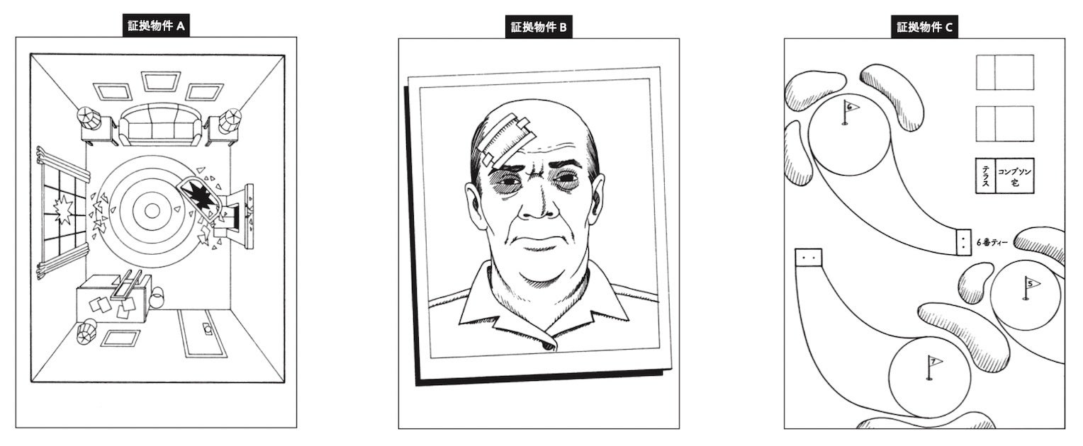 証拠物件Aはミスター・コンプソンの書斎と割れた鏡を示している。割れた窓を見れば、ゴルフボールが鏡がかけられようとしていた位置を直撃したことがわかる。
