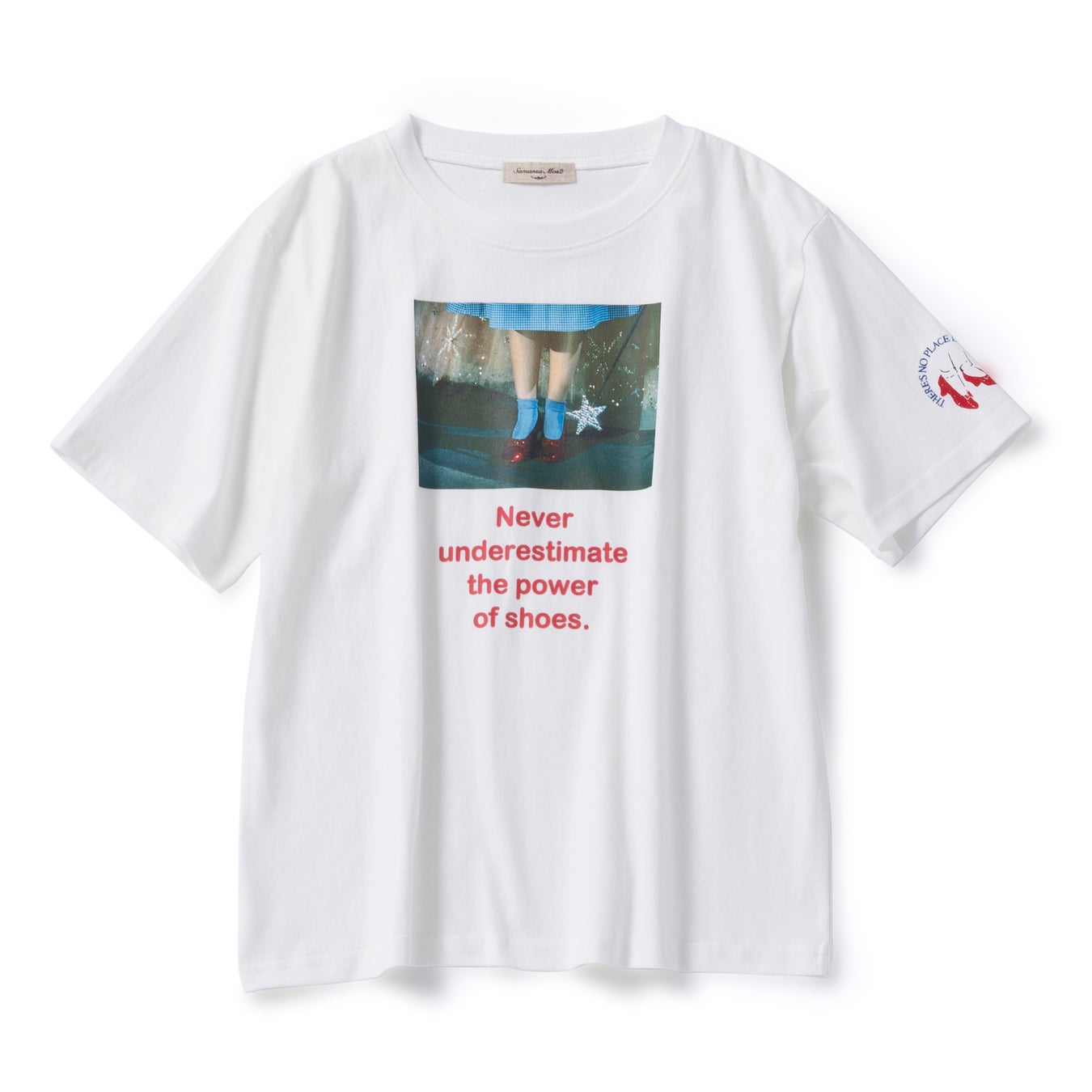 映画の名シーンをフロントにあしらったTシャツは、左袖に赤い靴のモチーフをプラスし、遊び心あふれるデザインに。