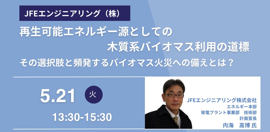 【JPIセミナー】JFEエンジニアリング(株)「再生可能エネルギー源としての木質系バイオマス利用の道標その選択肢と頻発するバイオマス火災への備え」5月21日(火)開催