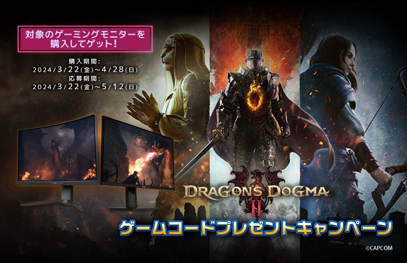 2024年3月22日(金)から2024年4月28日(日)までの期間中、対象のMSIゲーミングモニターを購入し、オンライン特設ページから応募するとSteam🄬 版『Dragon’s Dogma 2』のゲームコードをプレゼントします。