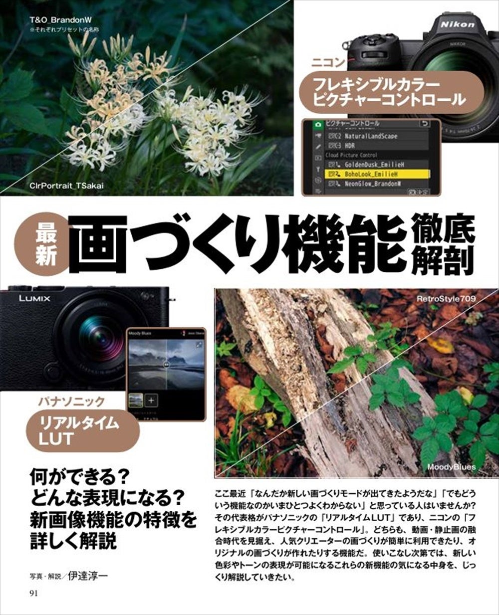 最近登場するカメラには、新しい画づくり機能(モード)が搭載されています。その代表格が、パナソニックの「リアルタイムLUT」と、ニコンの「フレキシブルカラーピクチャーコントロール」です。どちらも、動画・静止画の融合時代を見据え、人気クリエイターの画づくりが簡単に利用できたり、オリジナルの画づくりを設定できたりします。使いこなし方次第では新しい色彩やトーンの表現が可能になる魅力的な新機能を、じっくり解説します。