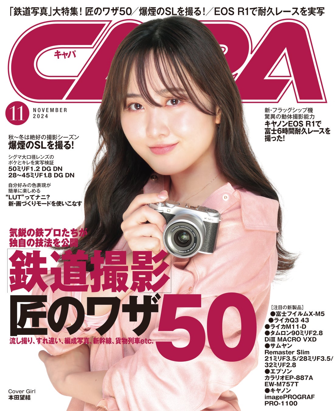 巻頭特集は「鉄道写真 匠のワザ50」。流し撮り、すれ違い、編成写真、新幹線、貨物列車などシーン別に役立つ撮影テクニックを公開するほか、撮影シーズンを迎える蒸気機関車撮影も必見です。さらに、ニコンZ6ⅢやパナソニックLUMIX S9に搭載される「最新・画づくり機能 徹底解剖」や、発売直前のキヤノン・フラッグシップ機の実力に迫る「EOS R1 ✕ モータースポーツフォトグラファー小林稔」、また進化が著しいアクションカメラを取り上げる「DJIとGoProの最新機種、優秀なのはどっち?」&「アクションカメラ 撮影スタート入門」などをお届けします、CAPA 11月号もカメラ・写真を楽しむための記事が満載です。