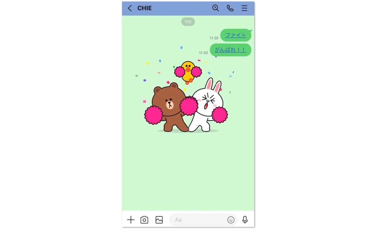 夏休み期間の勉強やスポーツ大会など、ユーザー同士で応援しあうコミュニケーションが多くなる時期に合わせて、今年から初めて、「LINE」のトークルームで応援アニメーションを開始しました。『ファイト』『頑張って!!』『頑張れ!!』『がんばれ!!』『応援してる』と送ると、ブラウンたちがチアダンスで応援してくれます。今後も受験シーズンでの実施などを予定しています。また、8月にはオープンチャット5周年を記念したアニメーションも初めて提供しました。