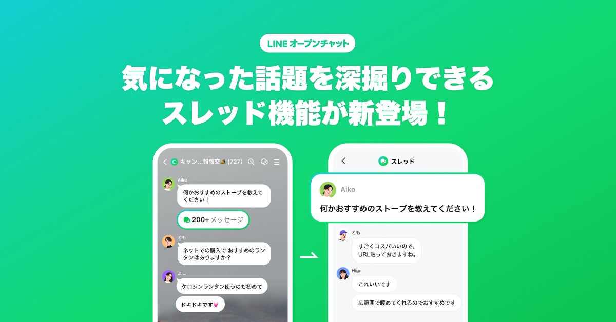 「LINE」内で使える「LINEオープンチャット」は、「LINE」の友だちではない年代や趣味など共通点がある人同士でトークや情報交換ができるチャットサービスで、今年で5周年を迎えました。サービスの利用者増加に伴い、やり取りについていけない、返信タイミングを逃してしまう、そんなユーザーの悩みを解決するために「スレッド機能」の提供を開始しました。メッセージごとにスレッドを作ることができるので、他の会話を邪魔することなく、特定の話題を掘り下げて話すことが可能になりました。