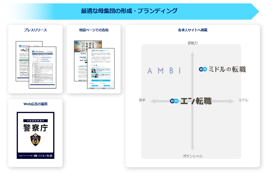 プレスリリースや特設ページ、Web広告での告知に加え、各求人サイトでの集客支援を実施。『エン転職』『AMBI』『ミドルの転職』とターゲットの異なる求人サイトを活用することで、ターゲットへ網羅的に求人を届けます。