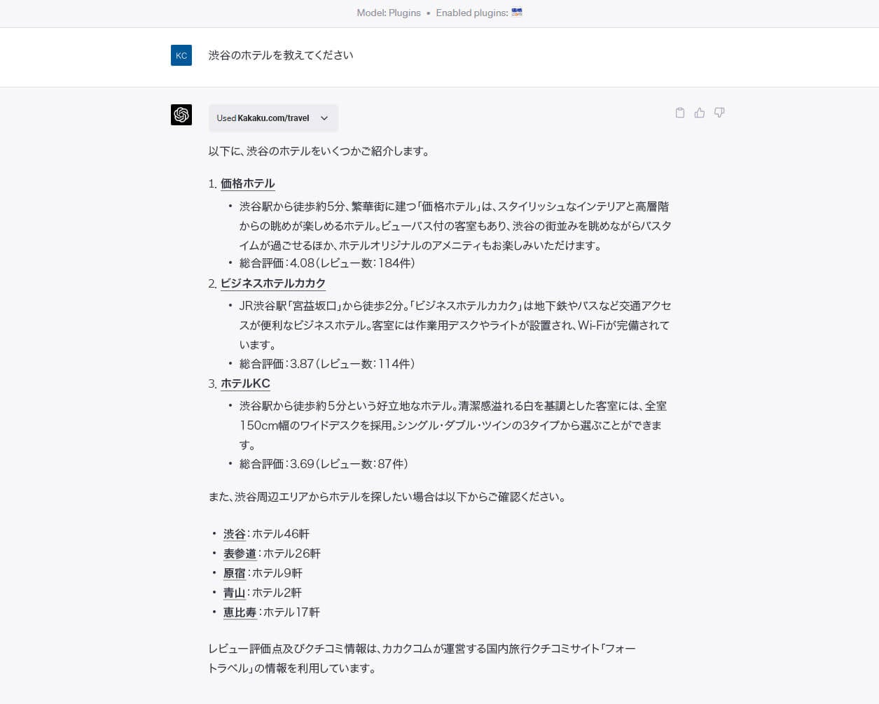 「価格.com 旅行・トラベル」、ChatGPTプラグインの提供を開始 -ChatGPTに宿泊施設情報とレビュー情報を連携、ChatGPTを使って希望するエリアの宿泊施設を簡単に検索できます-
