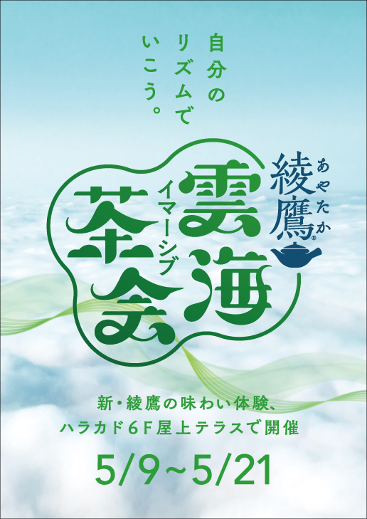 2024年5月9日(木)から21日(火)まで、東急プラザ原宿「ハラカド」6階屋上テラスにて、『綾鷹 雲海イマーシブ茶会』を開催します。日々の喧騒から離れて、自分のリズムを取り戻すひとときを体験できるような空間として雲海が出現し、その中で新しくなった「綾鷹」を無料で味わえます。また、会場内の様々な演出でフォトスポットとしても撮影をお楽しみいただけます。