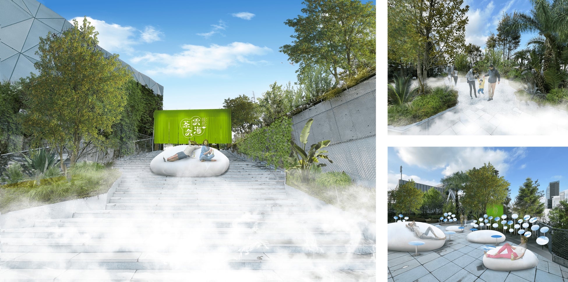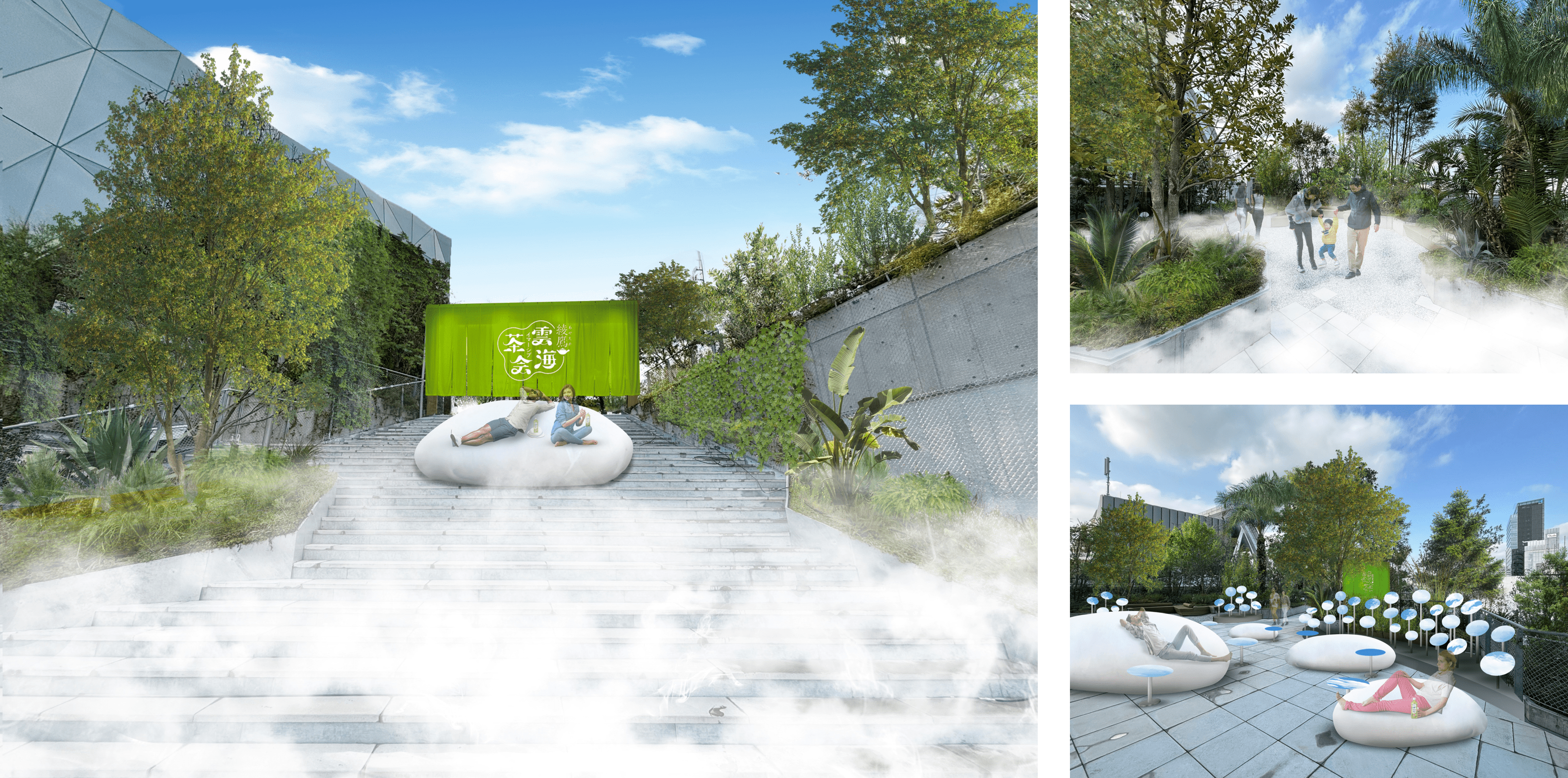 『綾鷹 雲海イマーシブ茶会』では、日本国内でも限られた条件でしか見ることができない“雲海”を4月にオープンした話題の新施設「ハラカド」の屋上テラスで出現させ、都心で気軽に雲海を愉しめる絶景空間を造りました。雲と同じ大きさの水粒を発生させるミストと、噴出した煙を冷却して発生させたスモークで雲海を演出します。会場には、まるで雲の上から大都会を見下ろすことができる天空の特等席や、雲海に包まれ触れることができる神秘的なエリア、映し出された無数の空と心地よい雲に抱かれるようにくつろげるエリアなど新感覚なイマーシブ体験が味わえます。