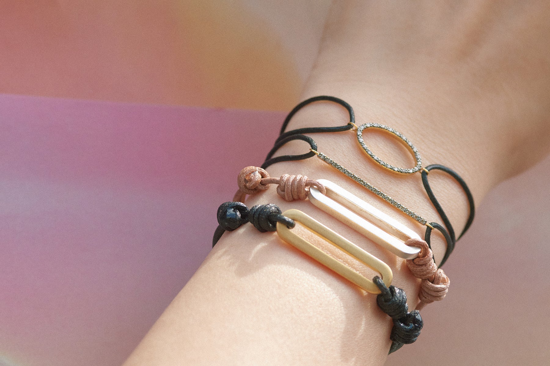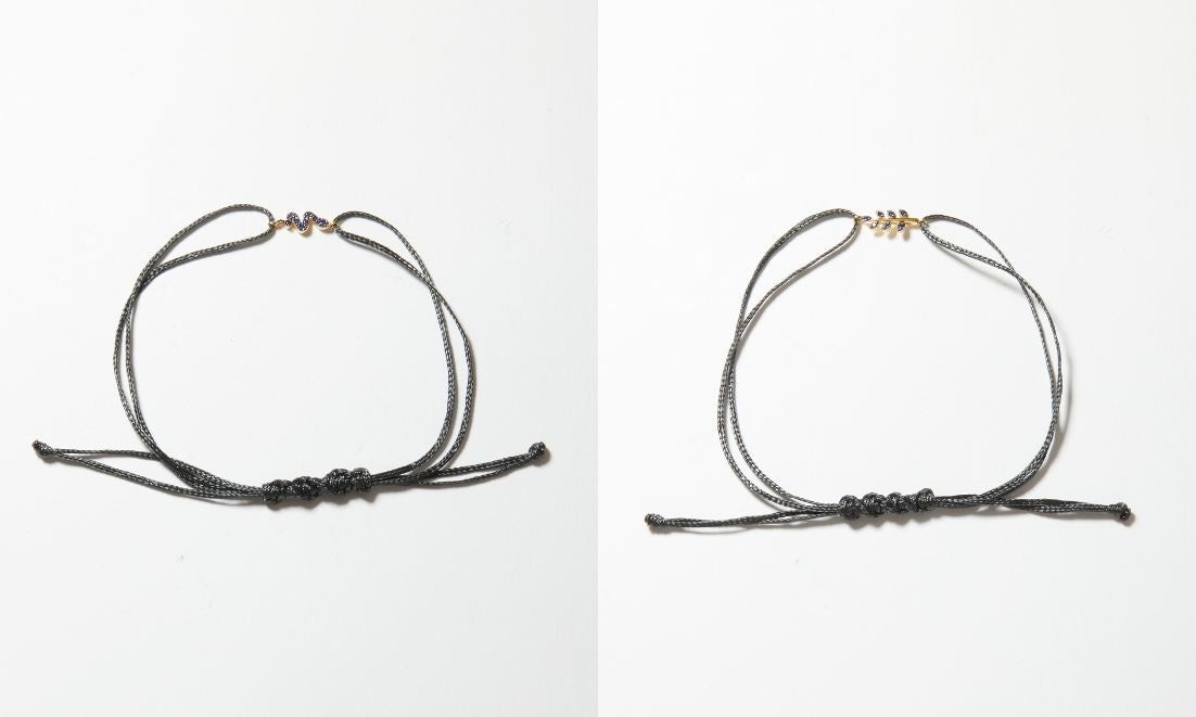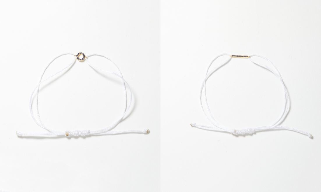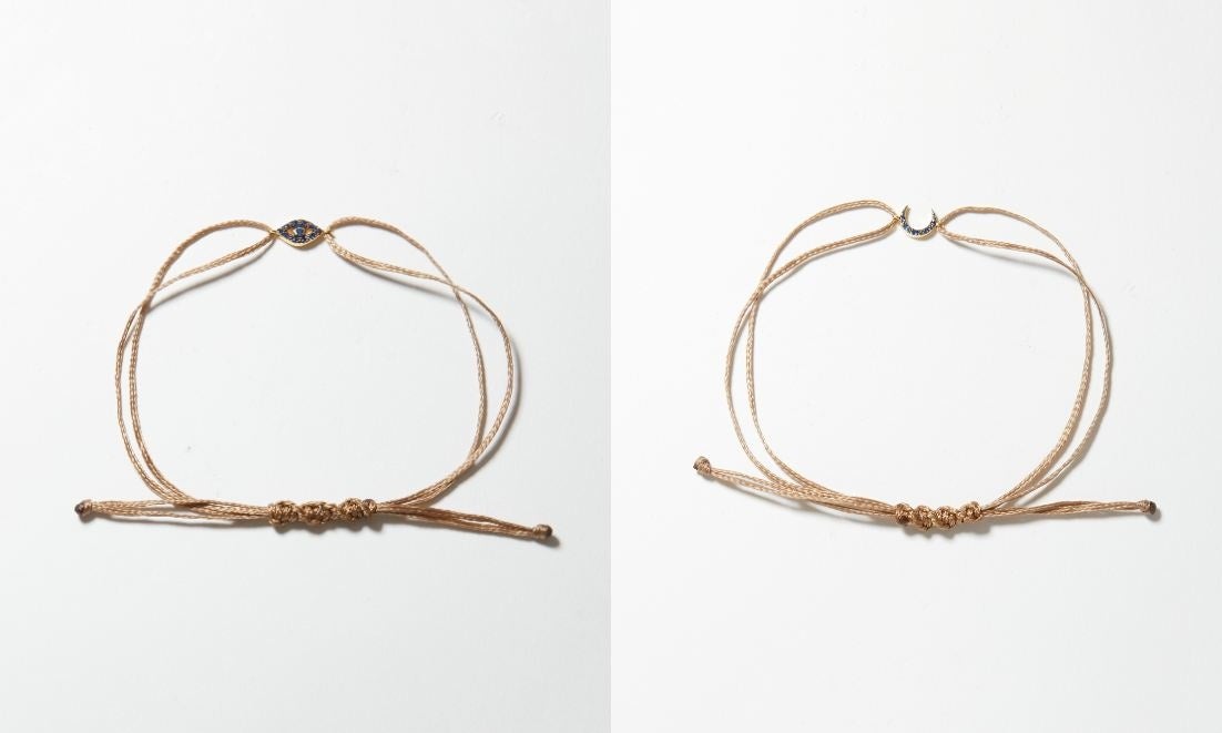 魔除けのシンボル“evil eye”と月の女神“selene”の新月モチーフ。そしてモダンなサークルモチーフとバーモチーフ。それぞれのモチーフにあわせて、コードブレスレットのカラーを変えています。
