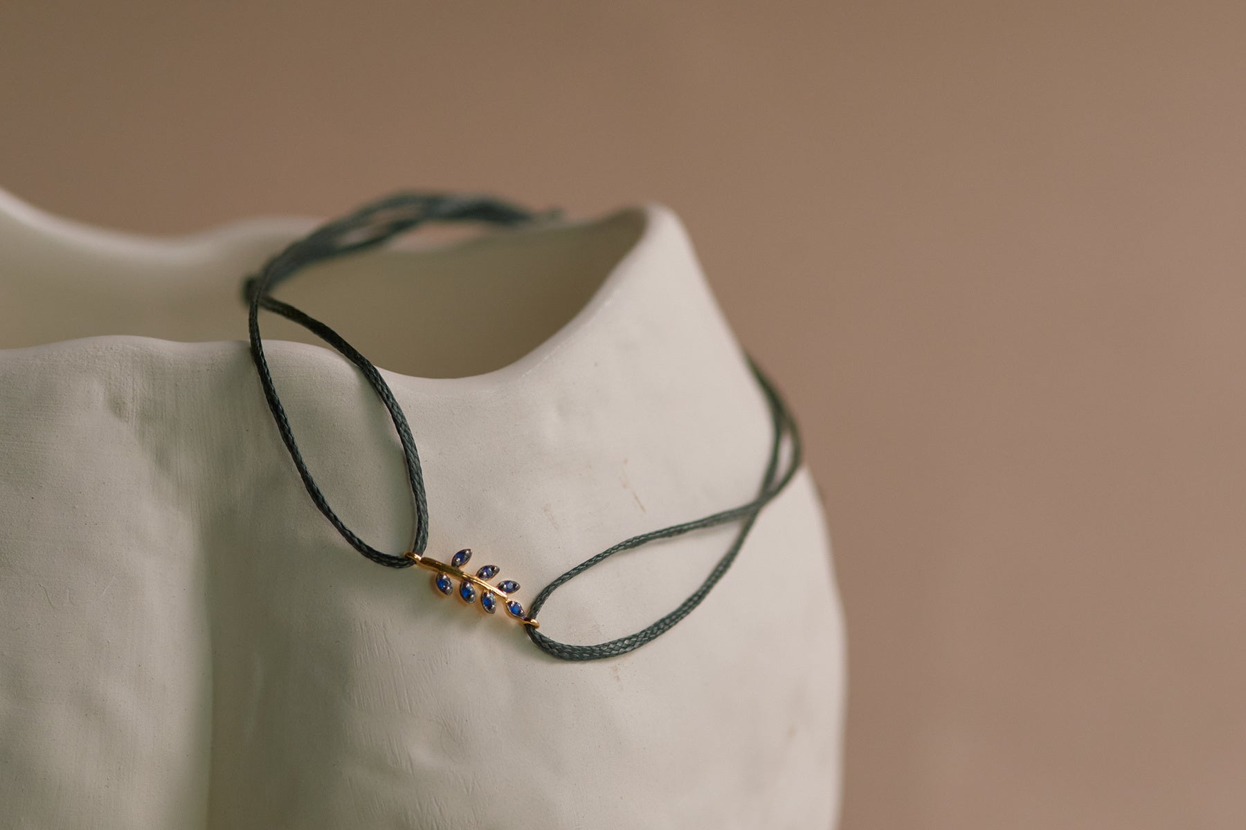 ブルーサファイアが煌めくコードブレスレット。ユニセックスなレザーコードが今年も登場。