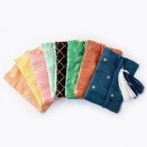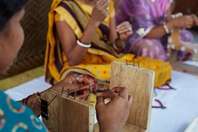 紐を組む工程はインドの女性を支援するNGOの女性たちが一点一点手作業で仕上げています。購入することで、彼女たちの収入をサポートすることにも繋がっています。