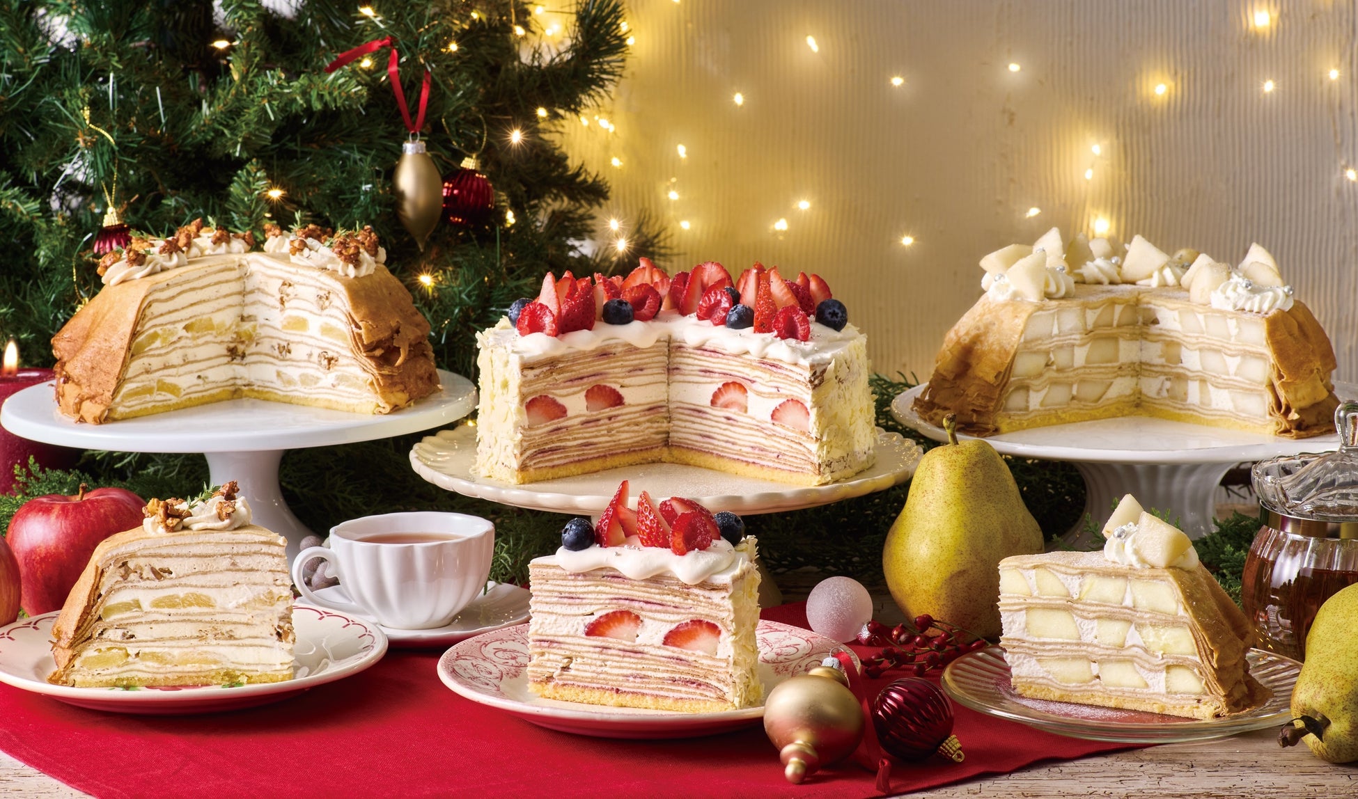 りんご、ベリー、洋梨など、心躍るクリスマスシーズンにふさわしい華やかなミルクレープを提案。