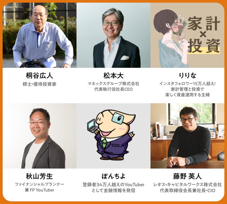 本イベントでは、お金のプロフェッショナルとして多様なゲストをお迎えし、この場でしか聞けないリアルな資産形成ノウハウや、お金にまつわる学びの基調講演をライブ配信でお届けします。参加者の皆さまは、気になる講演テーマ毎にご聴講いただくことが可能です※1。