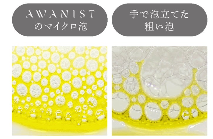 『AWANIST』では、注入したシャンプーを機器内部の網目の細かいフィルターを通して、空気とともに押し出すことで、濃密な泡を自動で作りだします。『AWANIST』を使用すると、手では作りにくいキメの細かなマイクロ泡が“15秒”で生成できます。