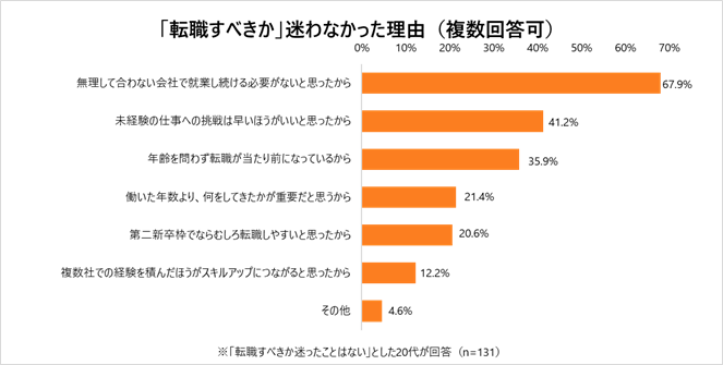(4)転職を迷わなかった理由は「未経験の仕事への挑戦は早いほうがいいと思ったから」が2番目に回答を集める
