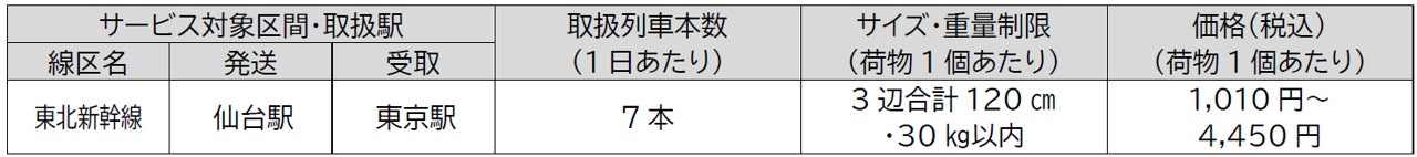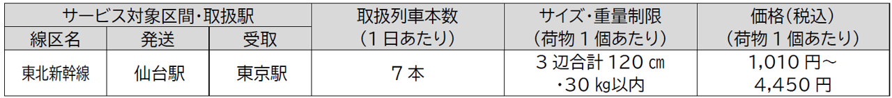 事前予約不要で、荷物1個から列車出発の30分前まで申し込み可能な新幹線による荷物輸送サービスです。現在は、東北新幹線(東京・仙台間、東京・盛岡間)、上越新幹線(東京・新潟間)、北陸新幹線(東京・金沢間、東京・長野間)で実施しています。(2024年8月2日現在)