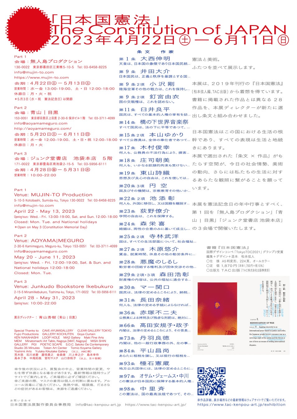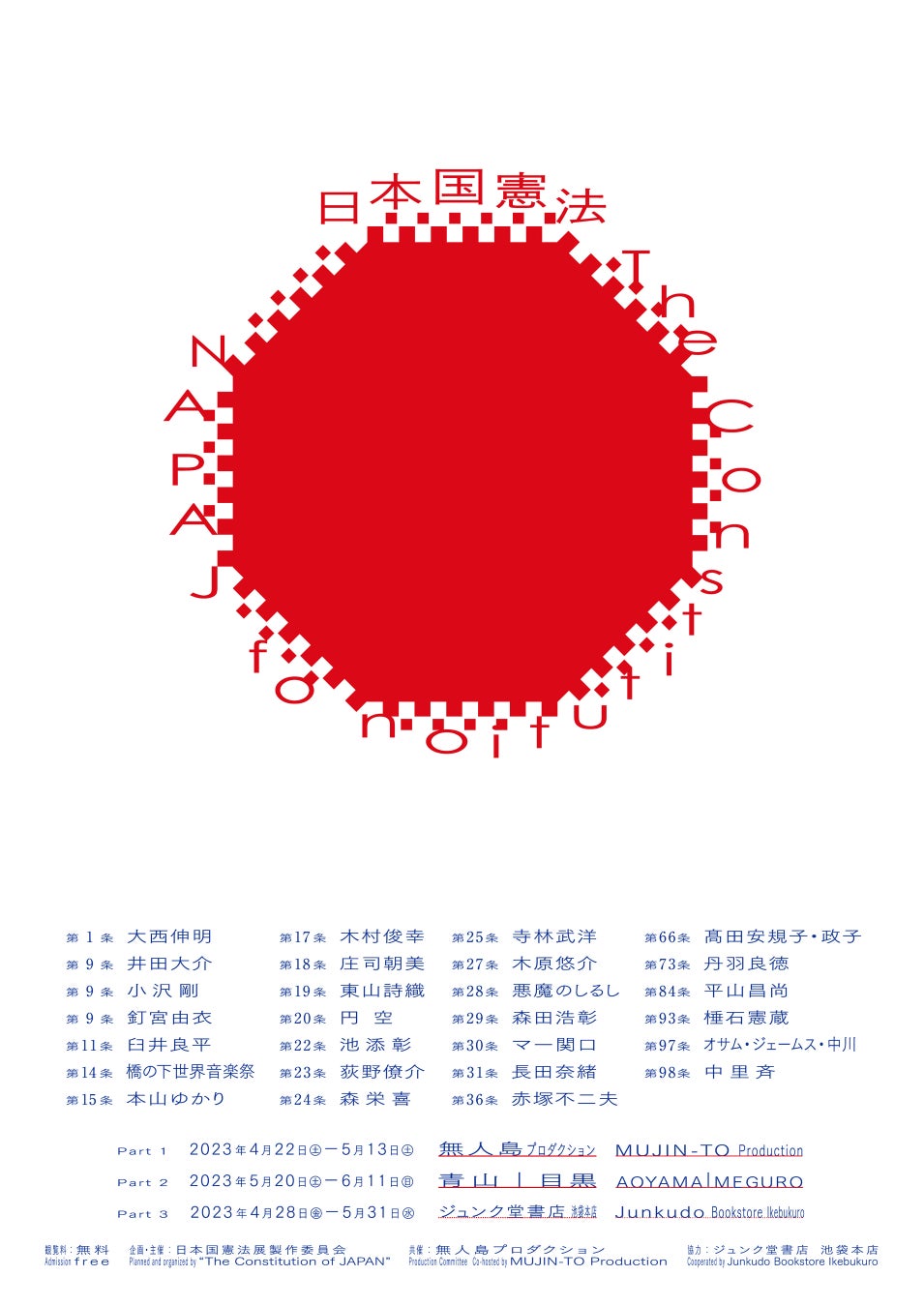 本展を憲法記念日の年中行事とすべく、その第1回を「無人島プロダクション」「青山 | 目黒」「ジュンク堂書店 池袋本店」の 3 会場で開催いたします。