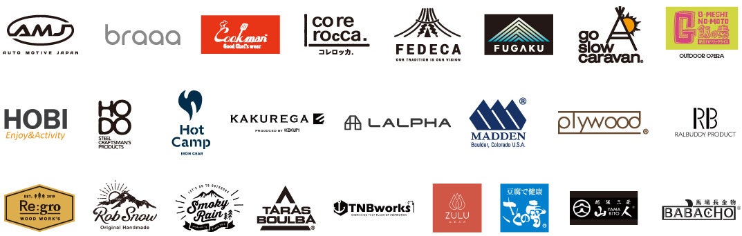 アウトドアスタイルのカスタムカーで人気の「AMJ」、外遊び好きのライフスタイルにフィットするアイテムを展開する「braaa」、遊び心に溢れたポップなグラフィックや機能素材をスマートに取り入れる「go slow caravan」、銘木のウッドハンドルが所有欲をくすぐる、ナイフブランド「FEDECA」、こだわりキャンパー御用達の東日本橋に店を構える「plywood」、炎の光をより幻想的に魅せる焚き火台で大注目のガレージブランド「RobSnow」、高クオリティかつ好デザインで統一感のあるプロダクトが充実する「TARAS BOULBA」、ギミックの効いたものづくりで人気を集める「ZULU GEAR」など、個性的なブランドを発表しました。