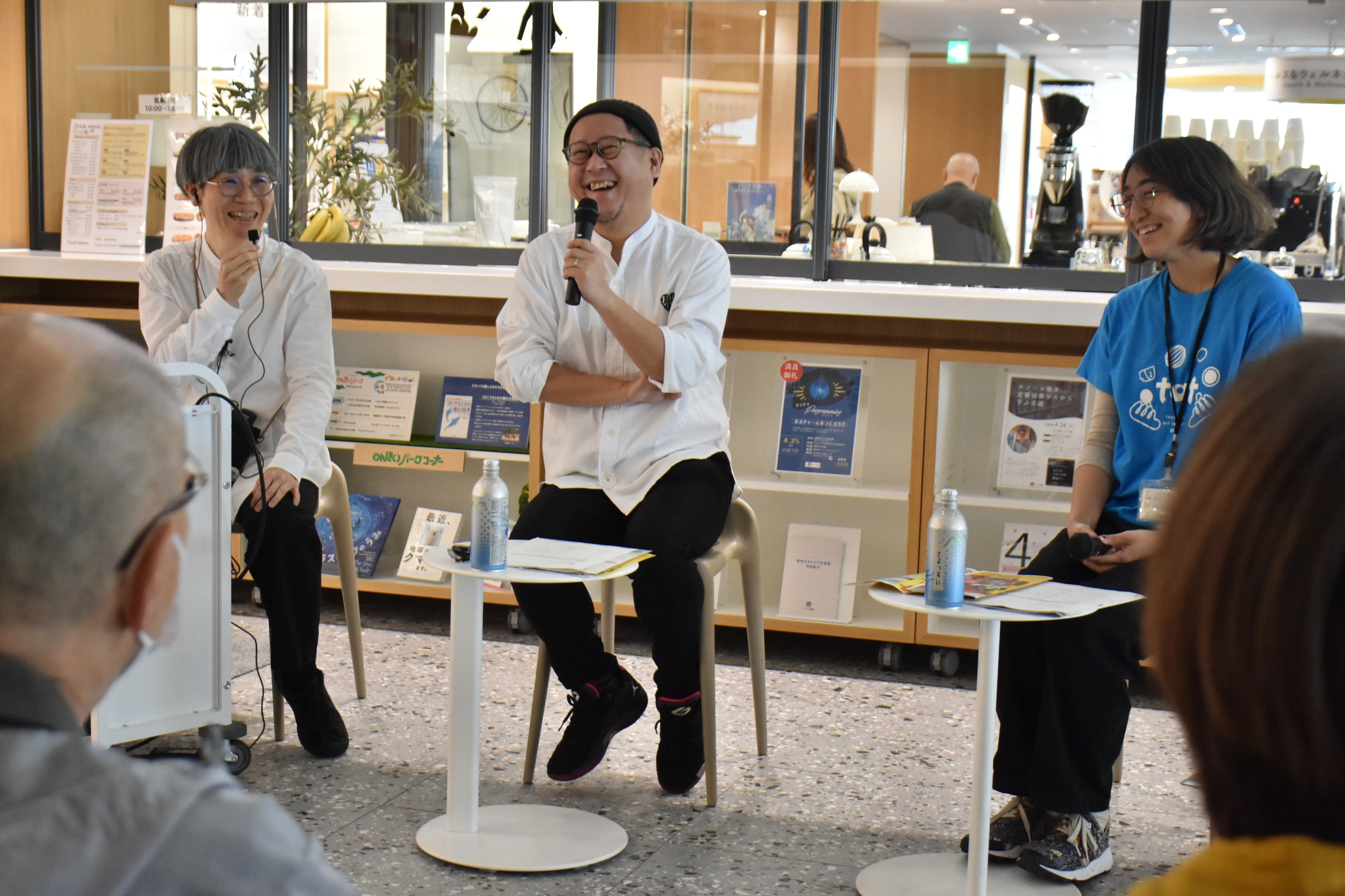 まちなか図書館の中央ステップであったトークイベント「ぷらっとおしゃべり 知って楽しむ! 『大道芸inとよはし』」には、橋本さんとプラットの大橋玲さんが登壇し、大道芸フェスの魅力や楽しみ方を語りました。