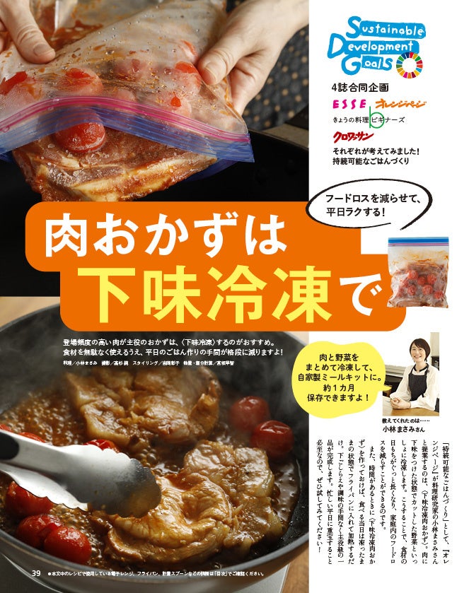『オレンジページ』からは、簡単なひと手間でおいしさが長もちする下味冷凍肉をご紹介。10分、時間があるときにこれをしておけば、忙しい日の晩ごはんづくりがグッとラクになります。フードロスが減らせるうえ、「あとは焼くだけ!」なのでお料理する人が断然ラクになりますよ~。
