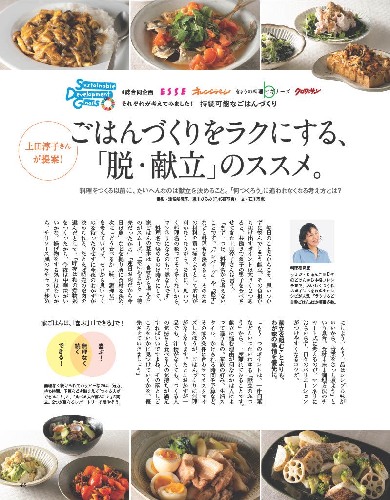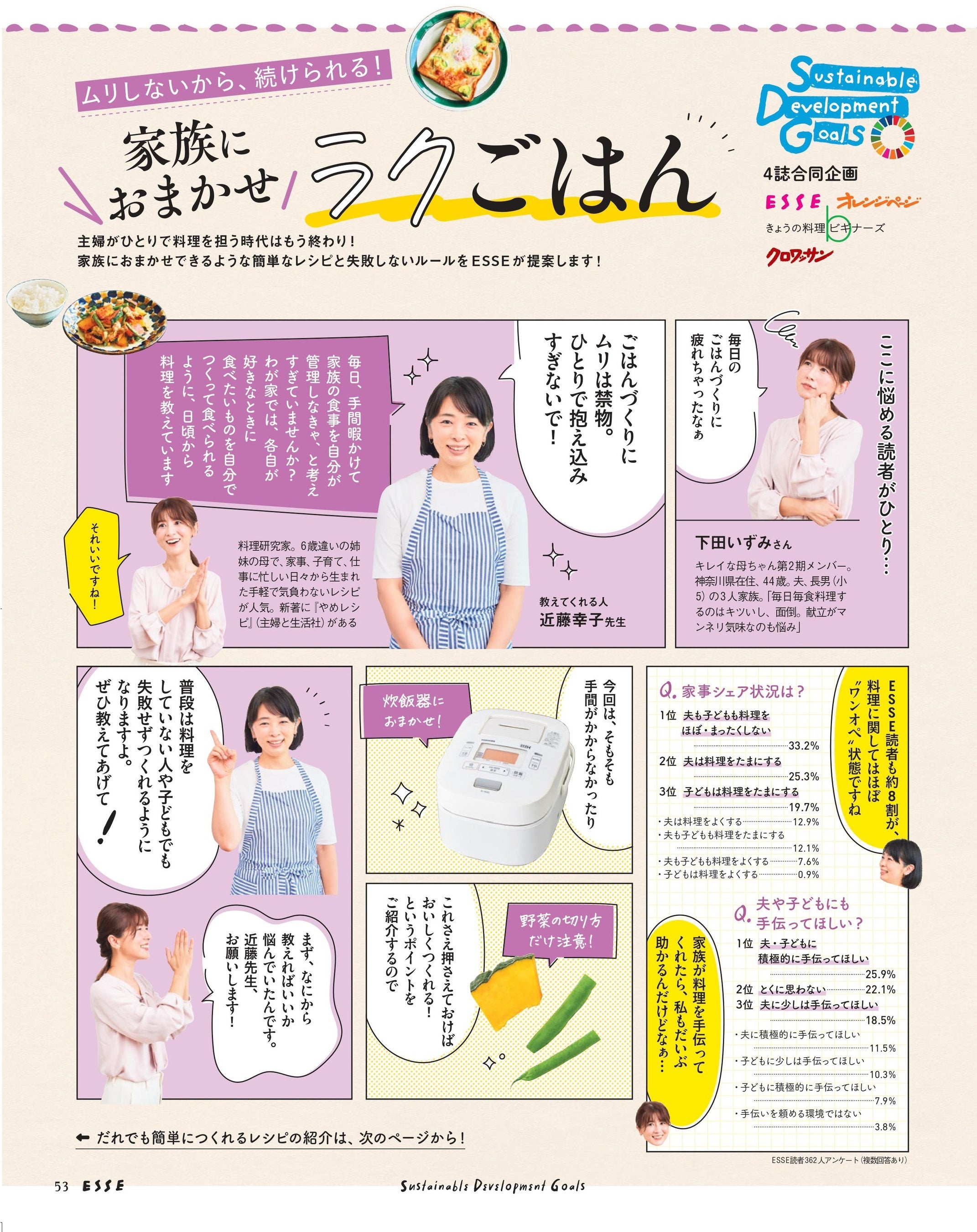 『ESSE』では、「たまには家族に料理を手伝ってもらえたら…」と悩む読者が、料理研究家の近藤幸子さんに、家族におまかせできちゃうレシピを教わります。料理が苦手な夫や子どもでも、一度覚えてしまえば料理がスイスイできるようになる“持続可能な”調理法&レシピを紹介します!