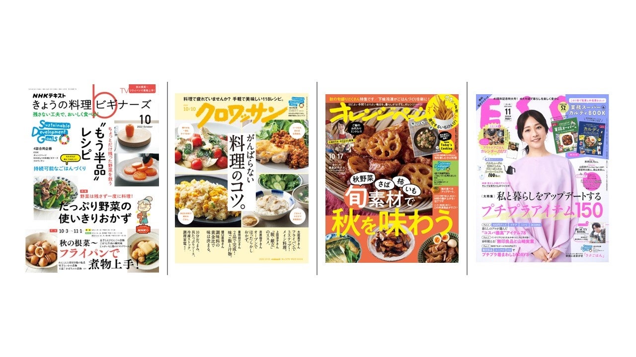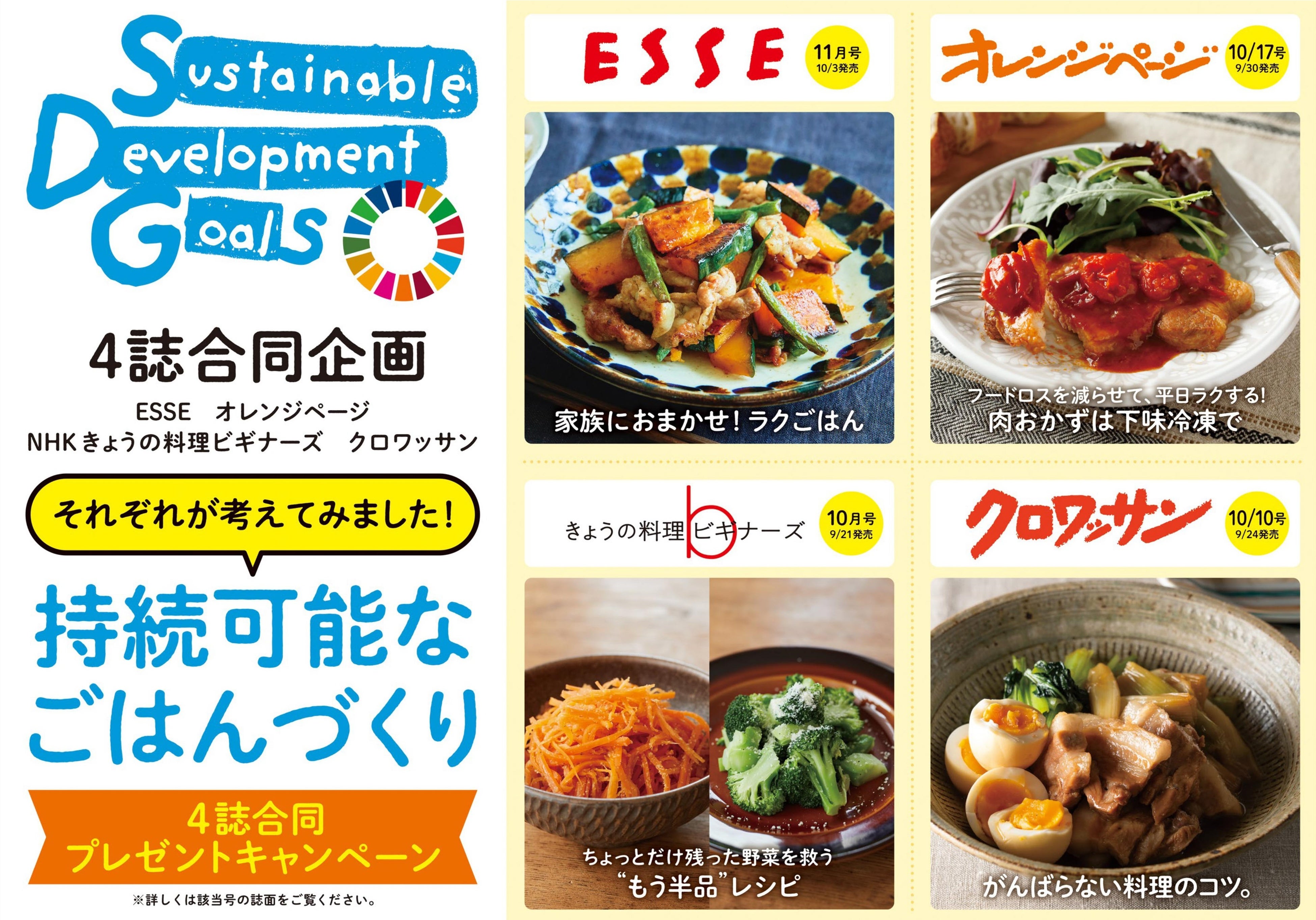 このたびは、株式会社扶桑社、株式会社オレンジページ、株式会社NHK出版、株式会社マガジンハウスの出版4社が、雑誌媒体の垣根を超えて「料理×SDGs」に関する合同企画「持続可能なごはんづくり」を実施することとなりました。SDGsの観点から料理を無理なく楽しくつくり続けるための特集記事をそれぞれ掲載するとともに、4誌合同のプレゼントキャンペーン、書店店頭でのフェア展開などを実施します。料理・生活実用情報を扱う雑誌が合同で特集企画を実施するのは極めて珍しい事例です。