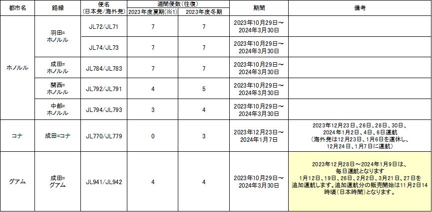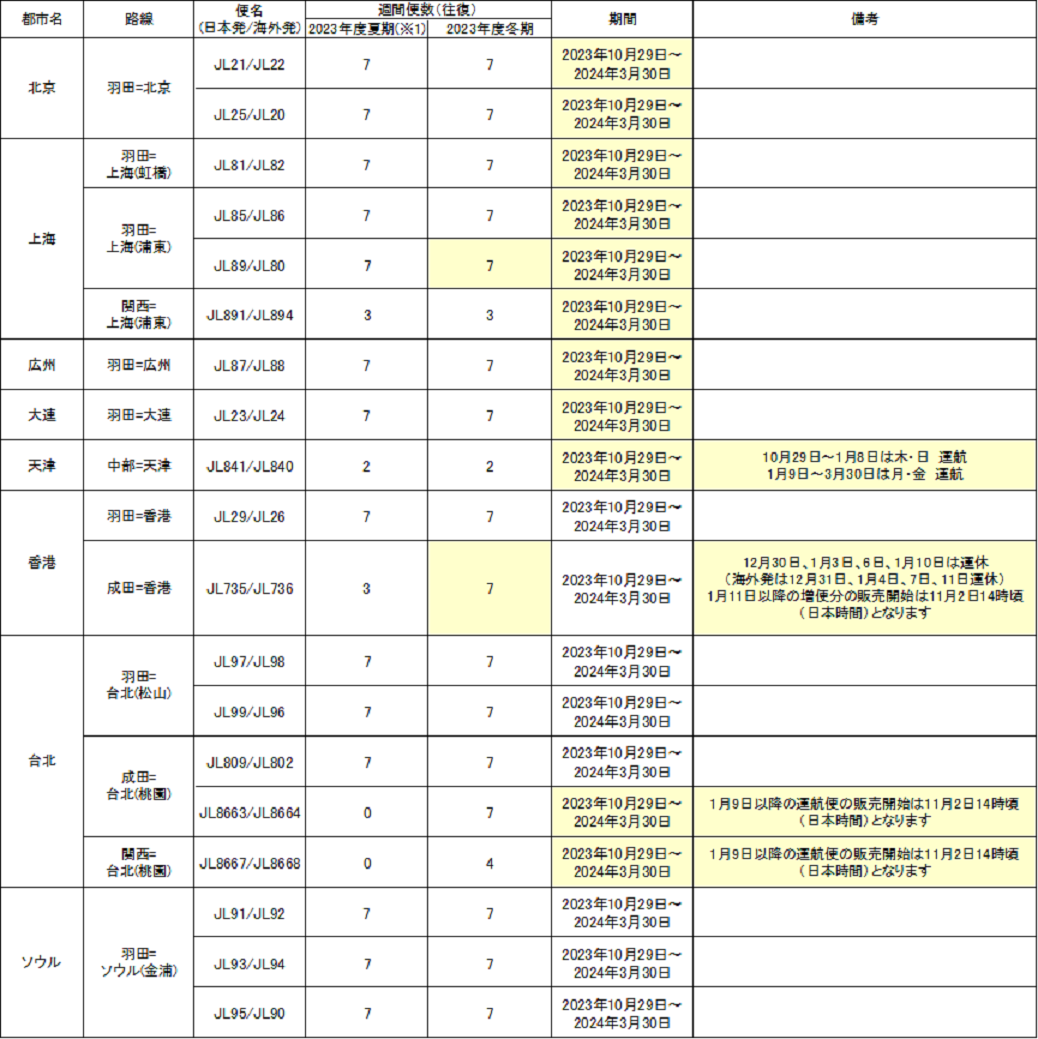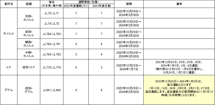 なお、以下に記載のない季節毎の増減便、季節運航便につきましては、JAL時刻表またはJAL Webサイトをご確認ください。