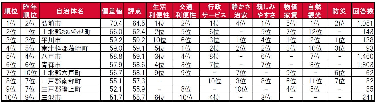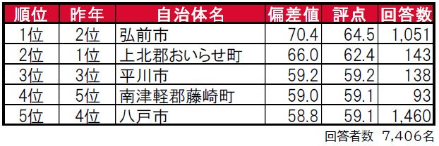 住みここちは、1位弘前市、2位上北郡おいらせ町。3位は2年連続で平川市。