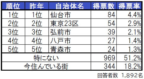 住みたい街1位は3年連続で仙台市。2位と3位は2年連続で東京23区と弘前市。