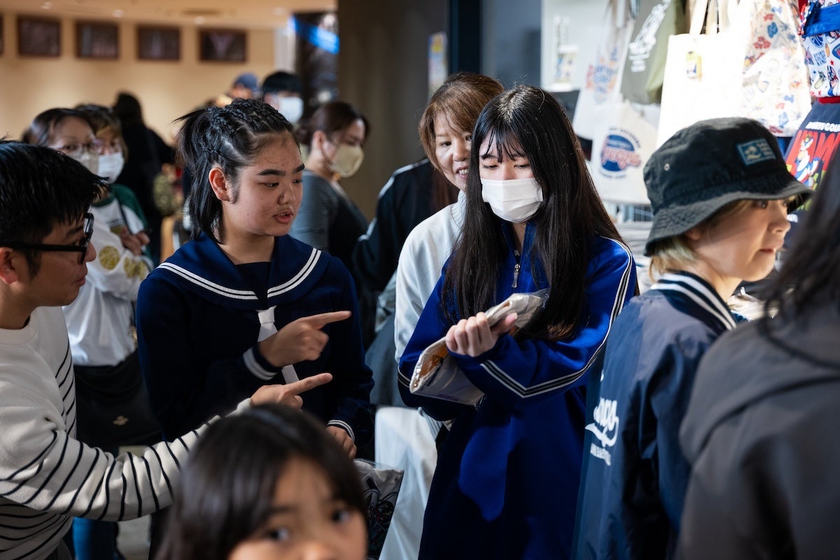 発売当日には、参加した中学生がアリーナショップ店頭で実際に接客体験を行い、宣伝したお客さまがオリジナルグッズを購入いただけたことに、喜んでいる様子でした。ハーフタイムには、コート上で沖縄市高江洲実教育長やお客さまに向けた成果発表も実施しました。