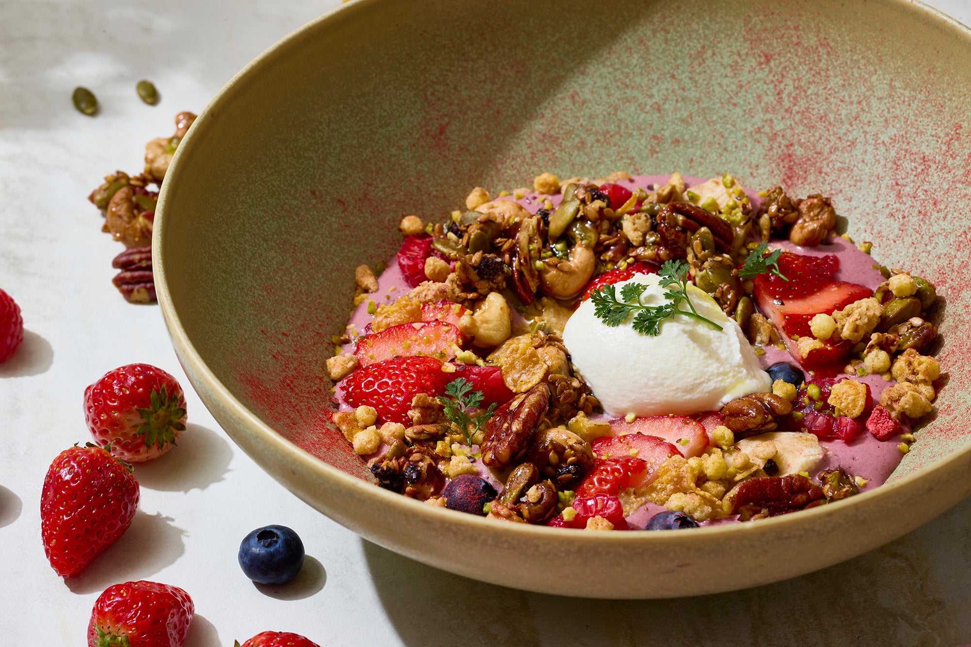 スーパーフードのアサイーとビタミン豊富ないちご、エネルギー源となるバナナと高タンパクなグリークヨーグルトを贅沢にミックスしたクリーミーな砂糖不使用のベース。その上には、ナッツやパンプキンシードなどのザクザクとした食感とローストされた香ばしさが広がる自家製スーパーフードグラノーラと、ほのかな甘みの小粒のグラノーラを敷き詰めました。フレッシュないちご、ブルーベリー、ラズベリー、バナナを彩り豊かに配し、仕上げには追いグリークヨーグルトを添えることで、最後の一口までより満足感のある「食べる美容液」のような一皿に仕上げています。