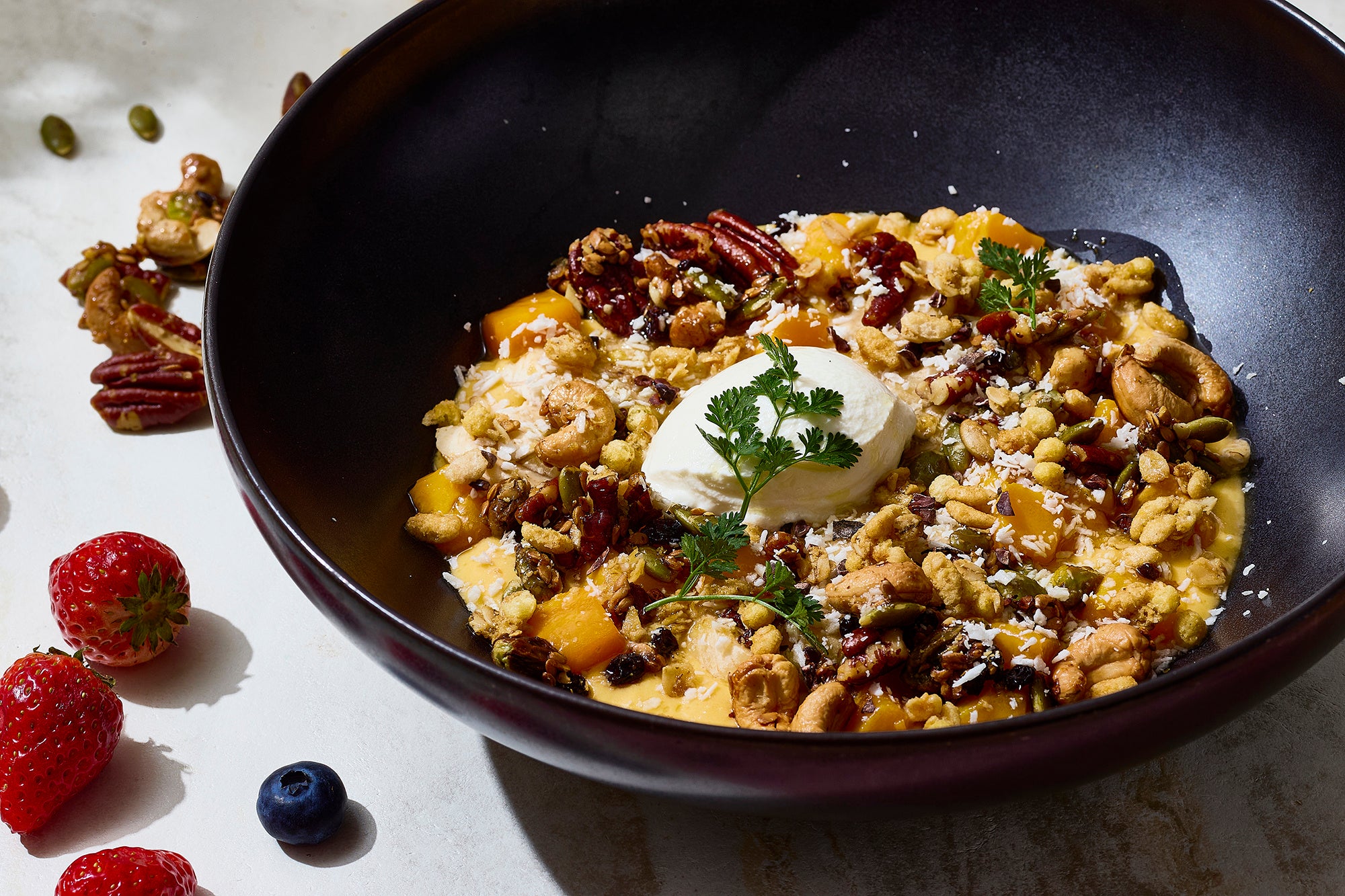 完熟マンゴーの濃厚な甘みと、バナナのまろやかさ、グリークヨーグルトの爽やかなコクが溶け合うビタミンカラーの砂糖不使用のヨーグルトボウル。アサイー&ベリーと同じく、ザクザクとした自家製グラノーラの食感に加え、フレッシュなマンゴーとバナナをトッピングしました。さらに、スーパーフードの「カカオニブ」の苦味と「ココナッツフレーク」の甘い香りをアクセントに添えることで、南国のエナジーを感じる重層的な味わいをお楽しみいただけます。