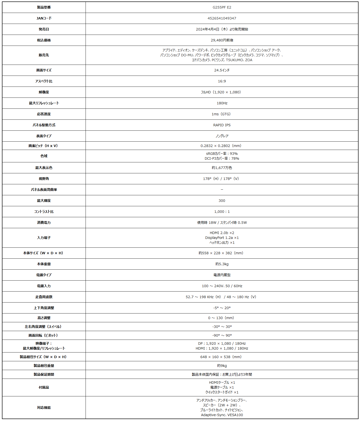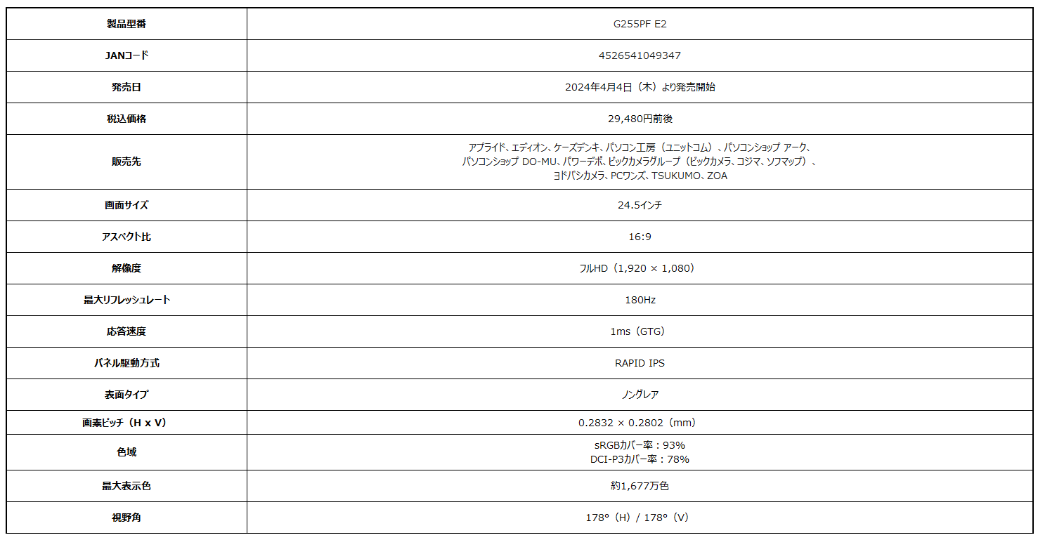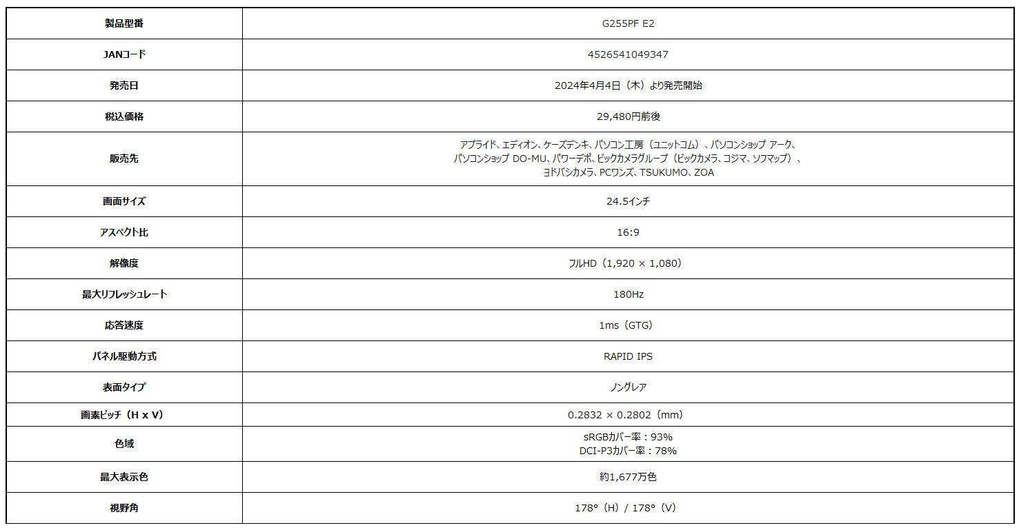 ■ G255PF E2製品ページ: https://jp.msi.com/Monitor/G255PF-E2